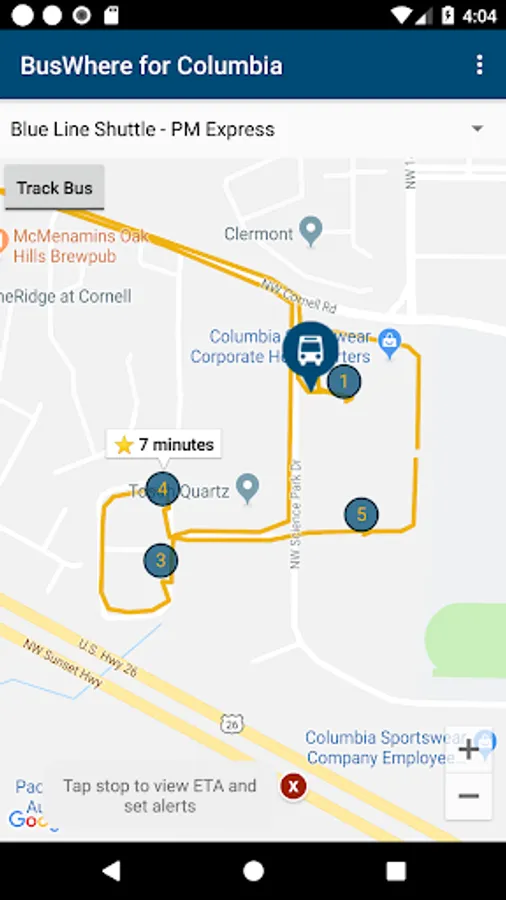 BusWhere for Columbia Sportswear is offered to enhance the experience of Columbia staff as they use the shuttle bus system. The BusWhere app will let you know when the next shuttle bus will arrive at any stop along the route.