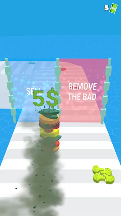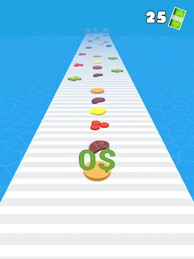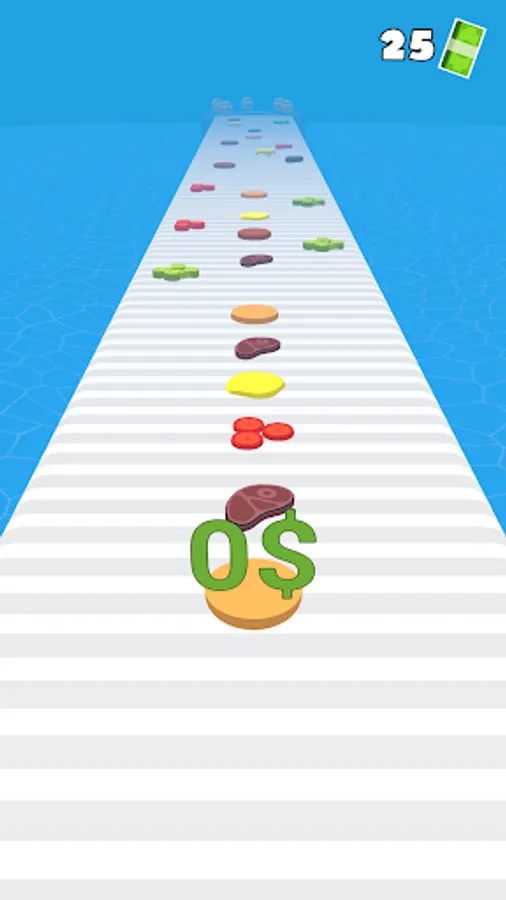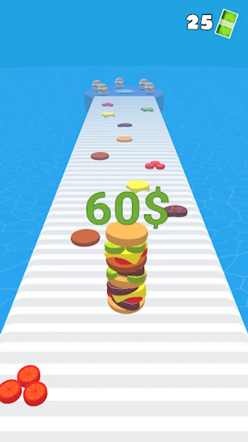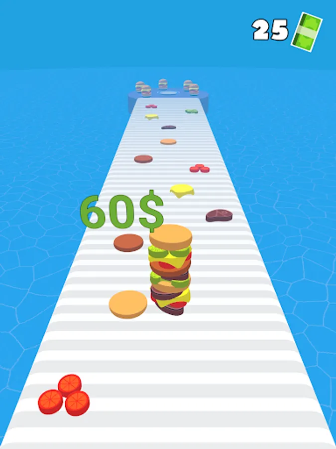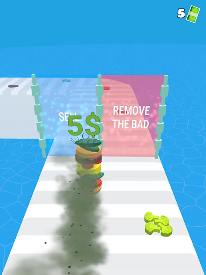 You need to collect the most delicious and juicy burger in the whole wide world! Various ingredients are scattered along the road: sausages, tomatoes, cheeses, but there are also bad ingredients: smelly socks, a fish skeleton, rotten bacon. If you pick up a bad ingredient, then the price of a burger will fall, the more good ingredients, the more expensive you can sell a burger