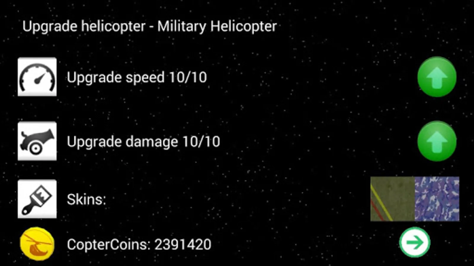 -3 helicopters with various skins, and upgrades