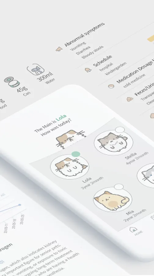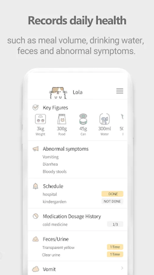 - Record daily health such as meal volume, drinking water, feces, respiratory rate, heart rate and abnormal symptoms.
