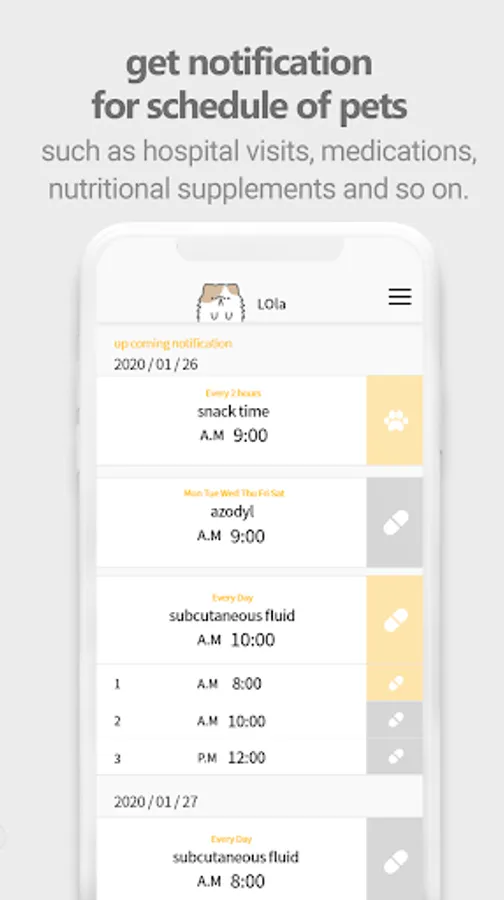 - get notification for schedule of pets such as hospital visits, medications, nutritional supplements and so on.