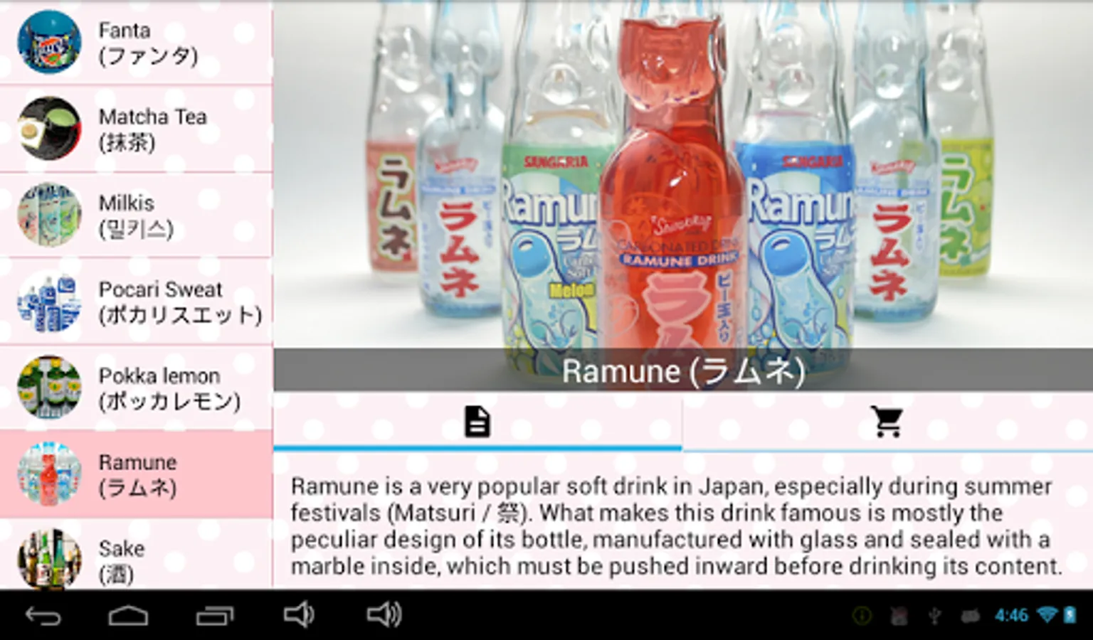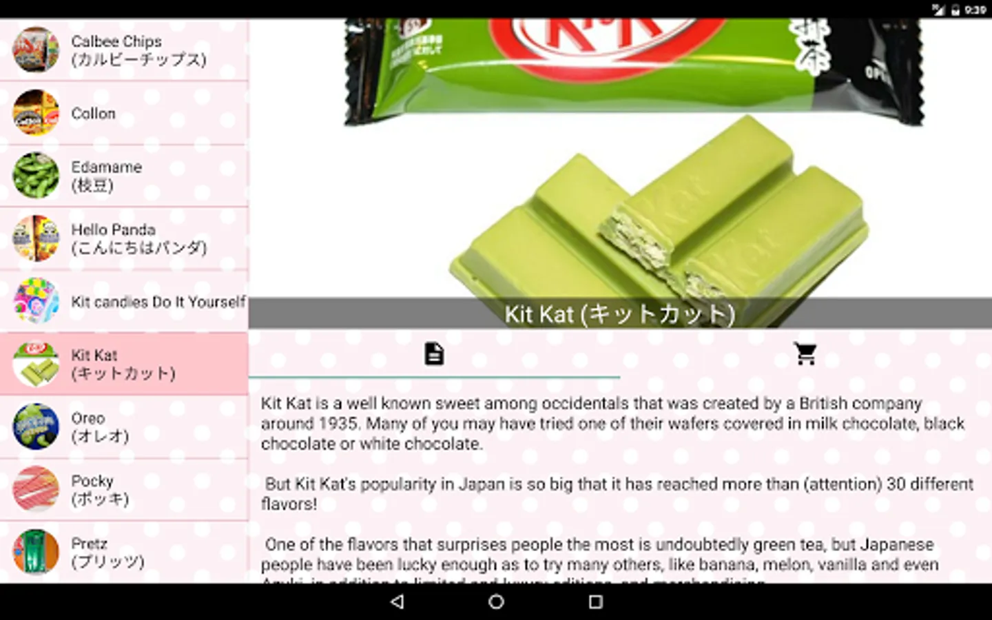 A colorful glossary of sweets that you can enjoy on both your Smartphone and Tablet, in which you can navigate through lots of Japanese sweets, ordered by category. And best of all, you don't need Internet to access all information from the glossary, it's available offline. Besides all the information about them, we will show you shops where you can buy them.