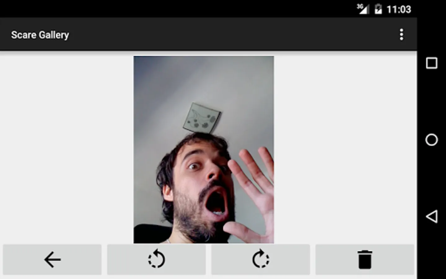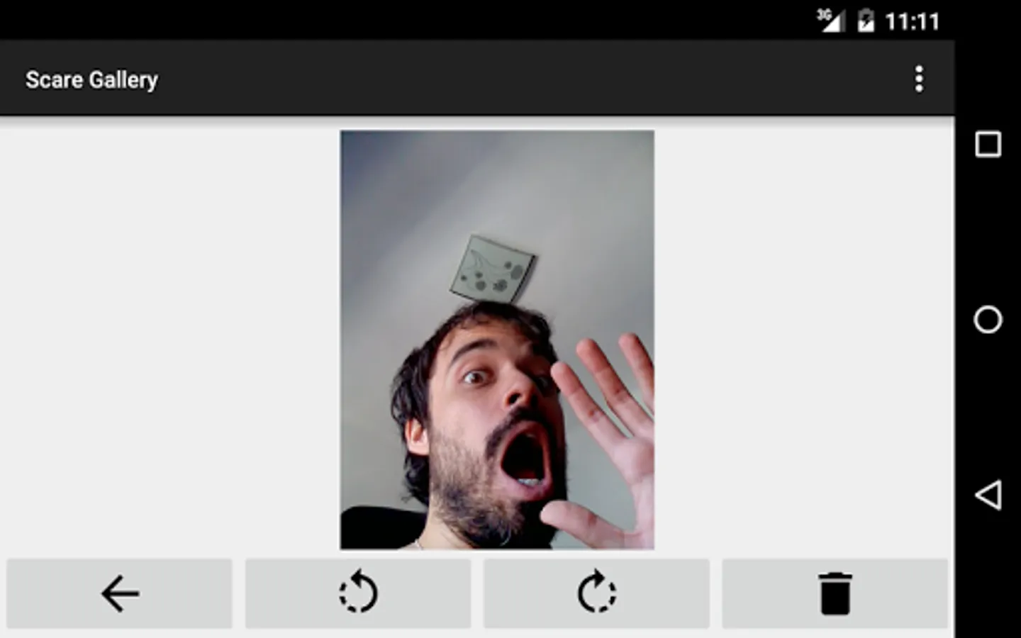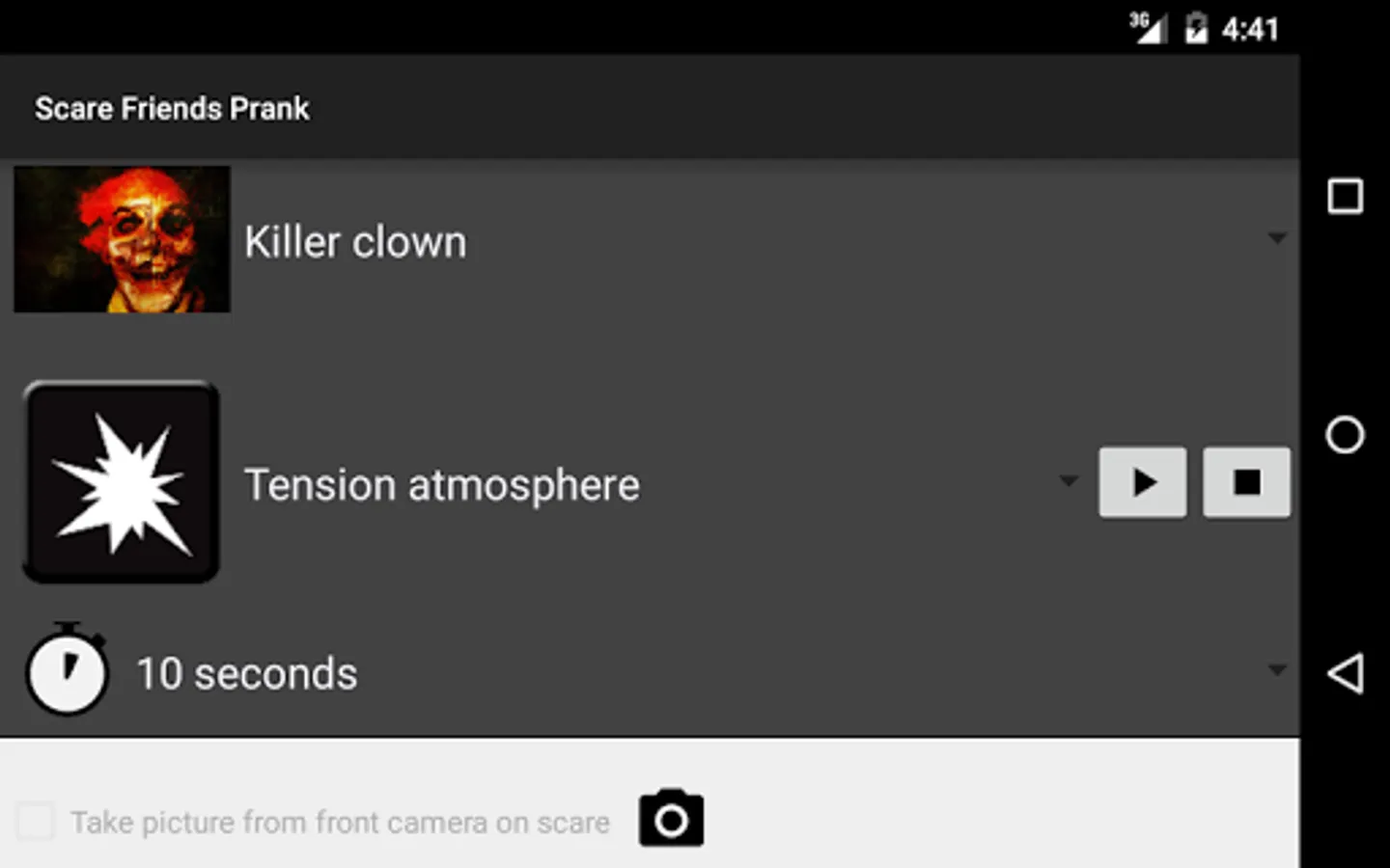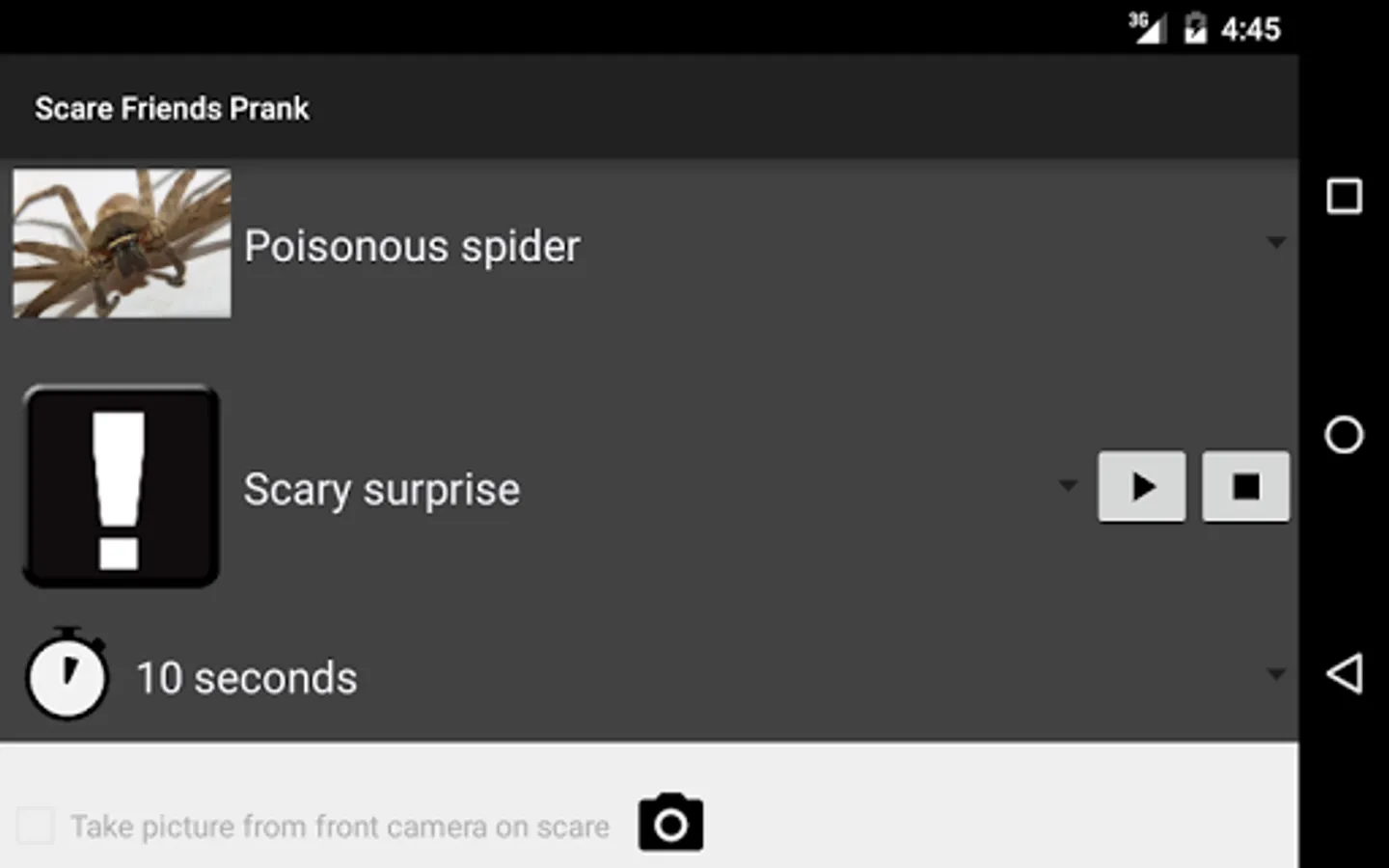 You just have to choose a terrifying picture of the gallery, a sound, a time for display, and also you can choose whether you want the phone to vibrate and if you want to take a picture of your friend in the moment of the joke.