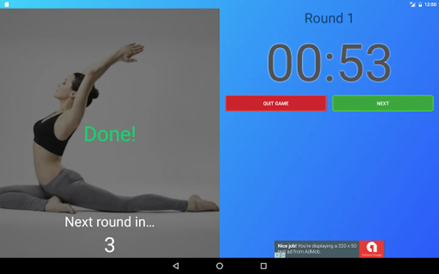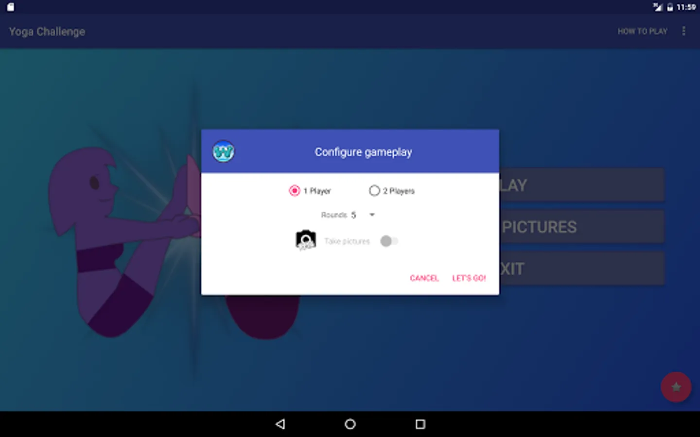 Yoga Challenge App improves this concept so you can focus on playing: Random Yoga Poses for 1 or 2 Players in coop, configurable number of rounds, a timer, final results screen, automatic picture taking during gameplay, ‘share in social networks’ option, integrated music player filled with songs perfect for Yoga, and much more.