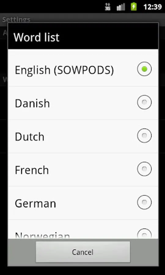 Wordwell has the following dictionaries: English, French, German, Dutch, Danish, Swedish and Norwegian. The word lists are stored online, keeping the app-size minimal.