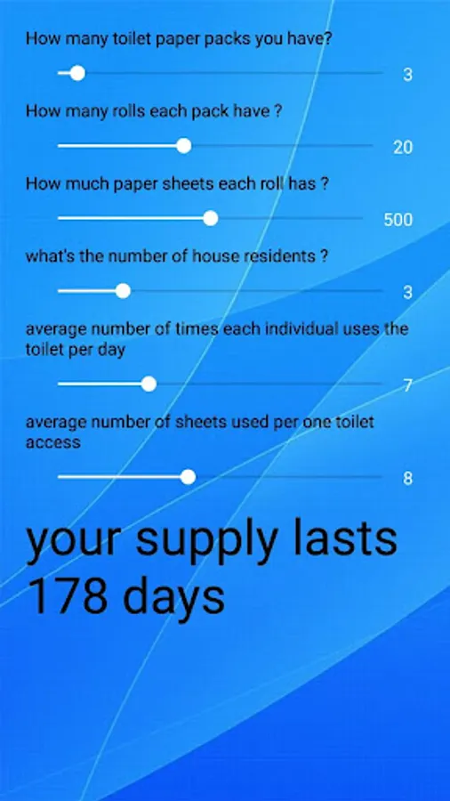 how much toilet paper lasts is an easy to use tool that helps you calculate the lifetime of your toilet paper stack and know how many days it lasts according to your provided information of daily use of the toilet