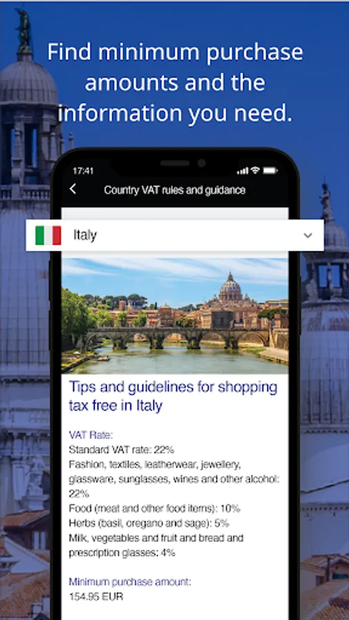 • Quickly find minimum purchase amounts and the tax free shopping rules and information