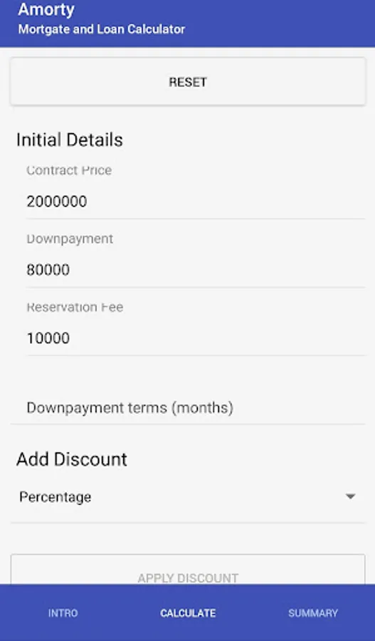 Amorty gives you the option to add discounts on either the downpayment or the total contract price and recalculates the amortisation amount based on this. You also have the option to add a reservation fee which will be deducted from the net downpayment.