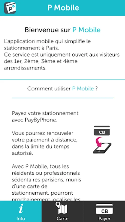 P Mobile is the application of the City of Paris, which facilitates payment visitor parking costs in the first 4 districts of Paris.
