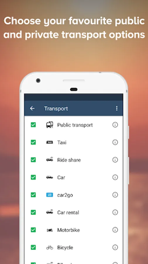 Personalize your trips by picking your route preferences. Never be late again by syncing TripGo with your agenda and getting exact departure times.