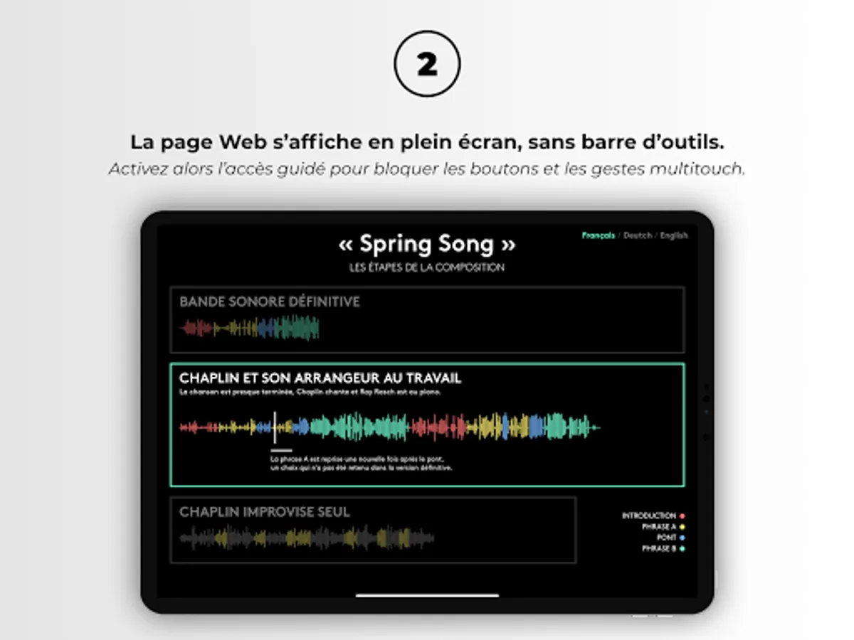 Combined with screen pinning (Settings> Security> Screen pinning and Lock device by PIN code)), the application can transform an iPad into a content distribution solution (exhibition cartels, terminal consultation in a museum, full screen video…).