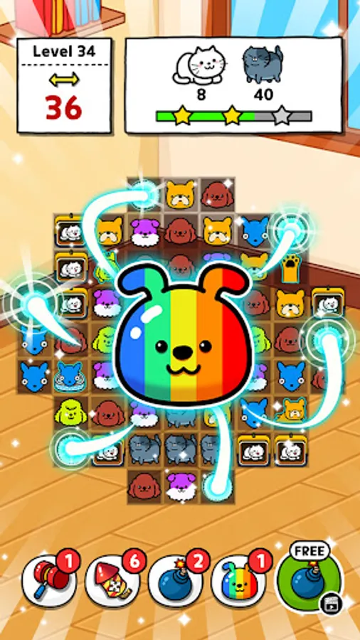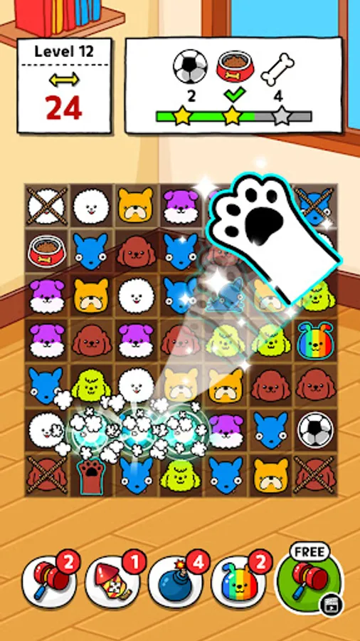 - Connect 3 same dogs to collect dogs