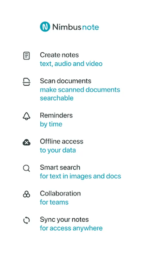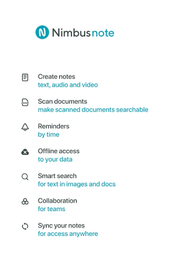 Nimbus Notes is a powerful notes app and organizer that helps you gather and organize your information — all in one place. There’s no need to spend time searching for your notes anymore. Create text notes, scan documents/business cards and make to-do lists. Synchronize it all with Nimbus Note for future viewing and editing on other devices.