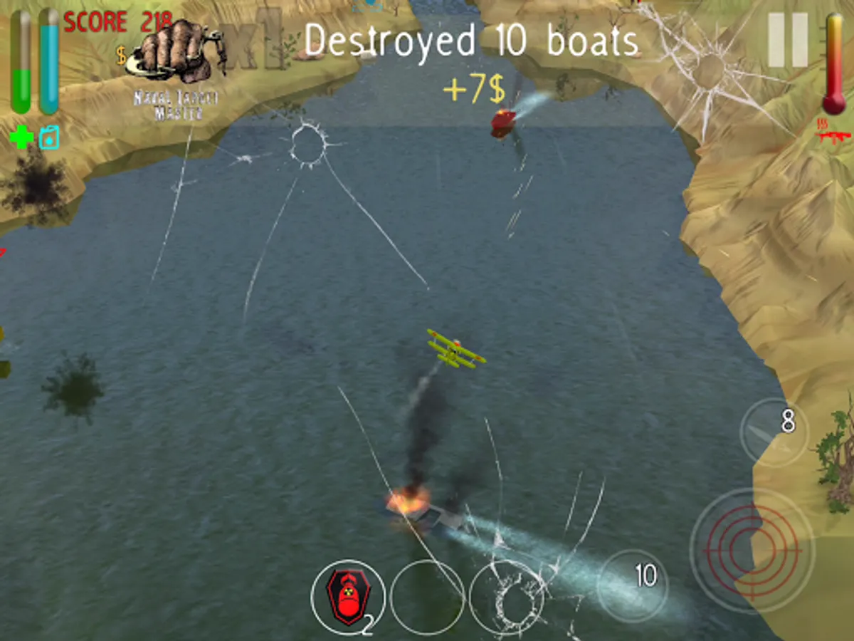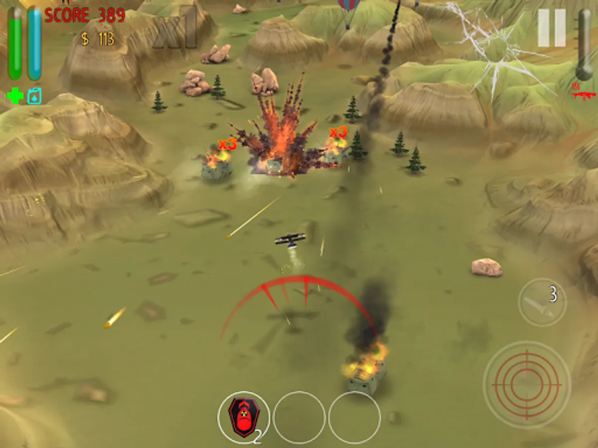 Armed observers, barrage balloons, blimps of all kinds, cannons, concrete pillboxes, firing points, tanks, gunboats, armored boats, fighters, interceptors, minesweepers, and many more enemies. Unlock achievements and reach unique enemies before you are destroyed by enemy fire or run out of fuel.