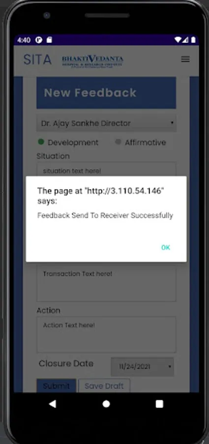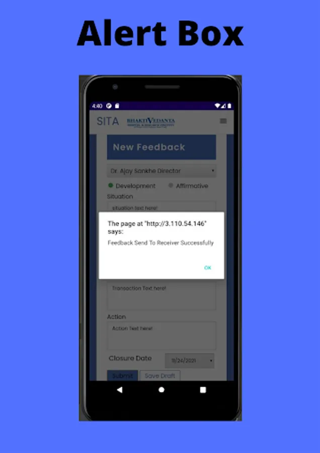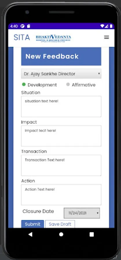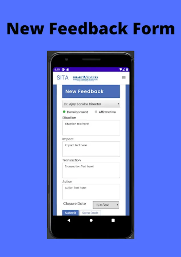 The main purpose of this app is anyone from an organization can share their views of some other person. Through this app they can easily describe specific behavior, the implication and how others feel, suggestion and plan short term, long term and continuous action needed. That's why the name given to this app is SITA - FEEDBACK TOOL.