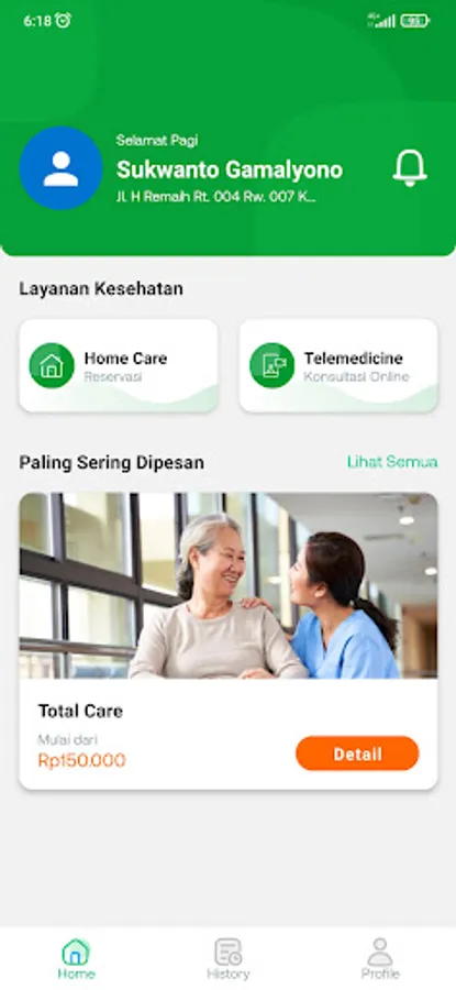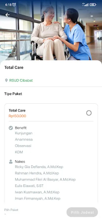 A list of service package options, health workers who will visit, schedules, and costs for being able to do Home Care are available in the application.