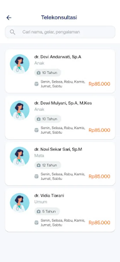 A list of preferred specialists, doctors, schedules, and costs for telemedicine is available in the app