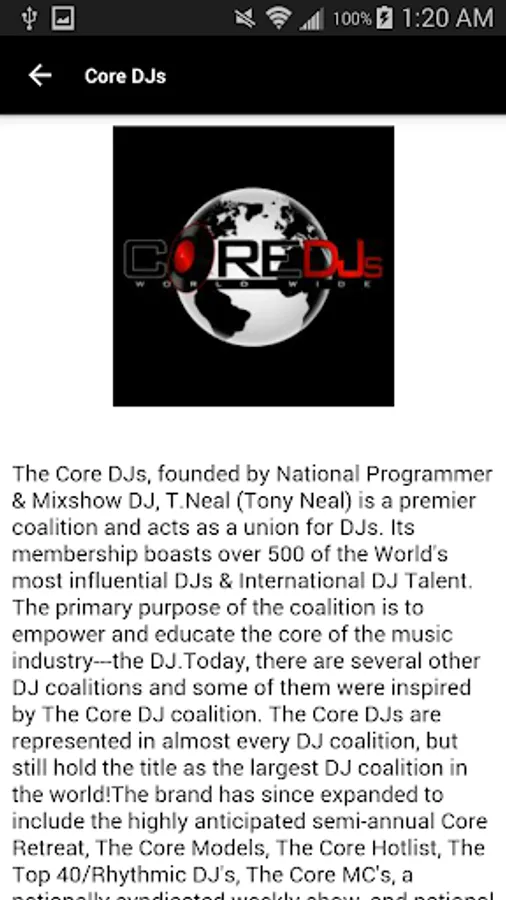 The Core DJs, founded by National Programmer & Mixshow DJ, T.Neal (Tony Neal) is a premier coalition and acts as a union for DJs. Its membership boasts over 500 of the World's most influential DJs & International DJ Talent. The primary purpose of the coalition is to empower and educate the core of the music industry---the DJ.