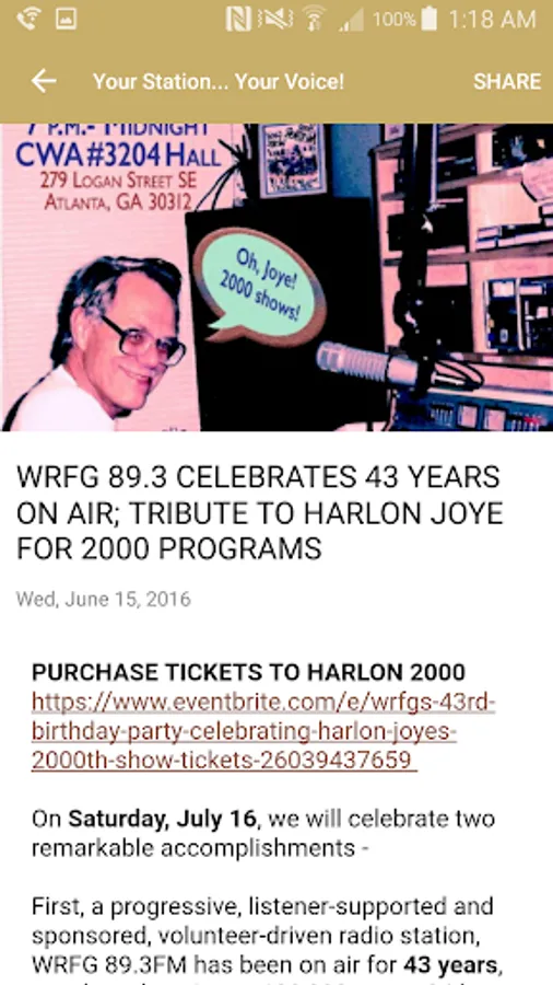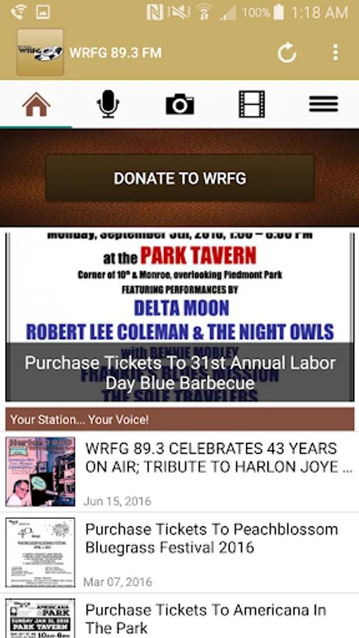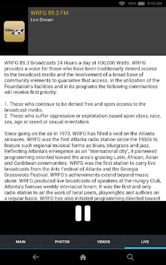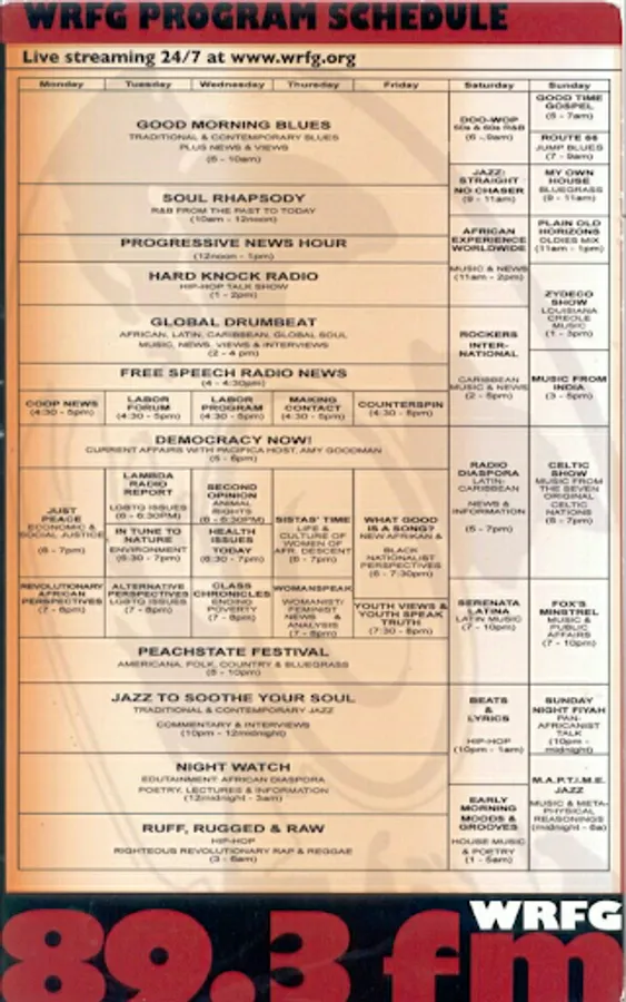 WRFG 89.3 Broadcasts 24 Hours a day at 100,000 Watts. WRFG provides a voice for those who have been traditionally denied access to the broadcast media and the involvement of a broad base of community elements to guarantee that access. In the utilization of the Foundation's facilities and in its programs the following communities will receive first priority: