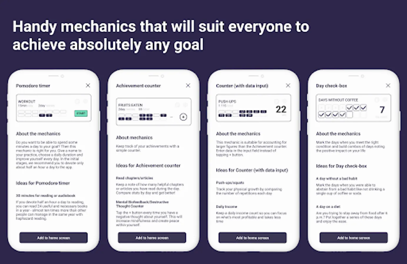 The problem with the daily goals is that it’s hard to keep the forming habit. That’s why the tracker you use gives you a faster and more spectacular result if it matches your lifestyle. In a modern multitask daily life a simple app with different types of goal trackers becomes a more motivational and effective than any other.