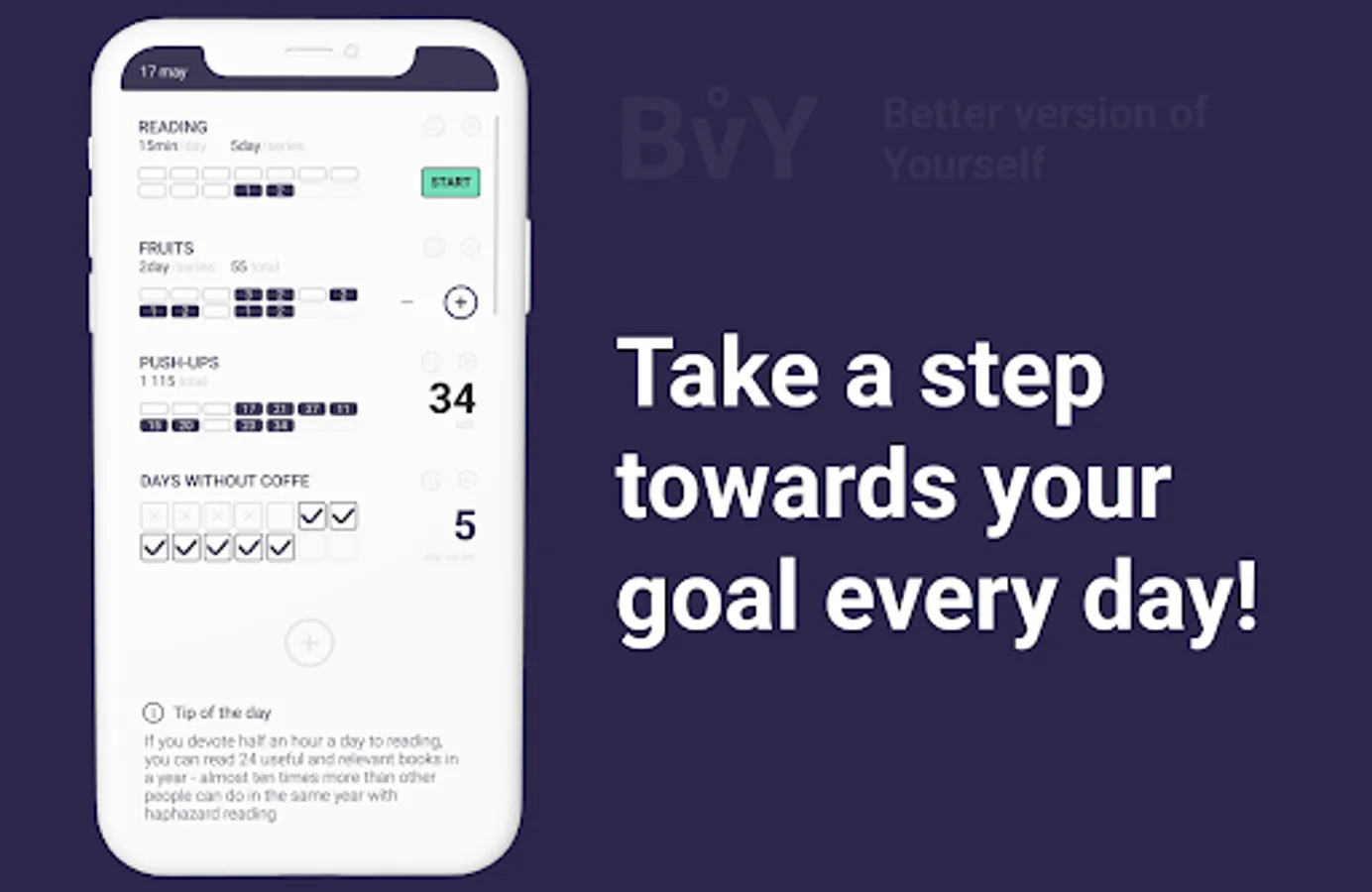 Half an hour Theory App can replace all the traditional paper habit builders and bullet journals. The problem of habit tracking with them is that you whether should take the tracker with you, and this don’t let you feel free (you should keep in mind and can forget them still). Or the routine tracker is attached to a place (your room, for example) – you leave and you lose it, thus feeling that the goal tracking is a burden, the strides are not great and you are not free.When you miss steps to the goal, the motivation is fading away, as a result you stop trying. The BVY App is a motivational app – the goal tracker that is always with you in your mobile.You don’t have to control it – the App itself operates all the annoying routine that stands between you and your dream. The BVY App is a reliable accountability partner that plays on your side when you are challenging yourself.