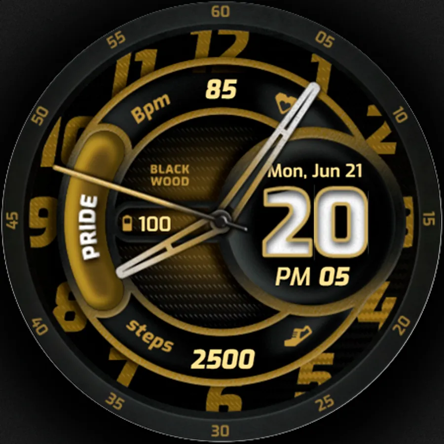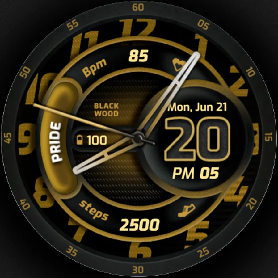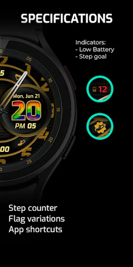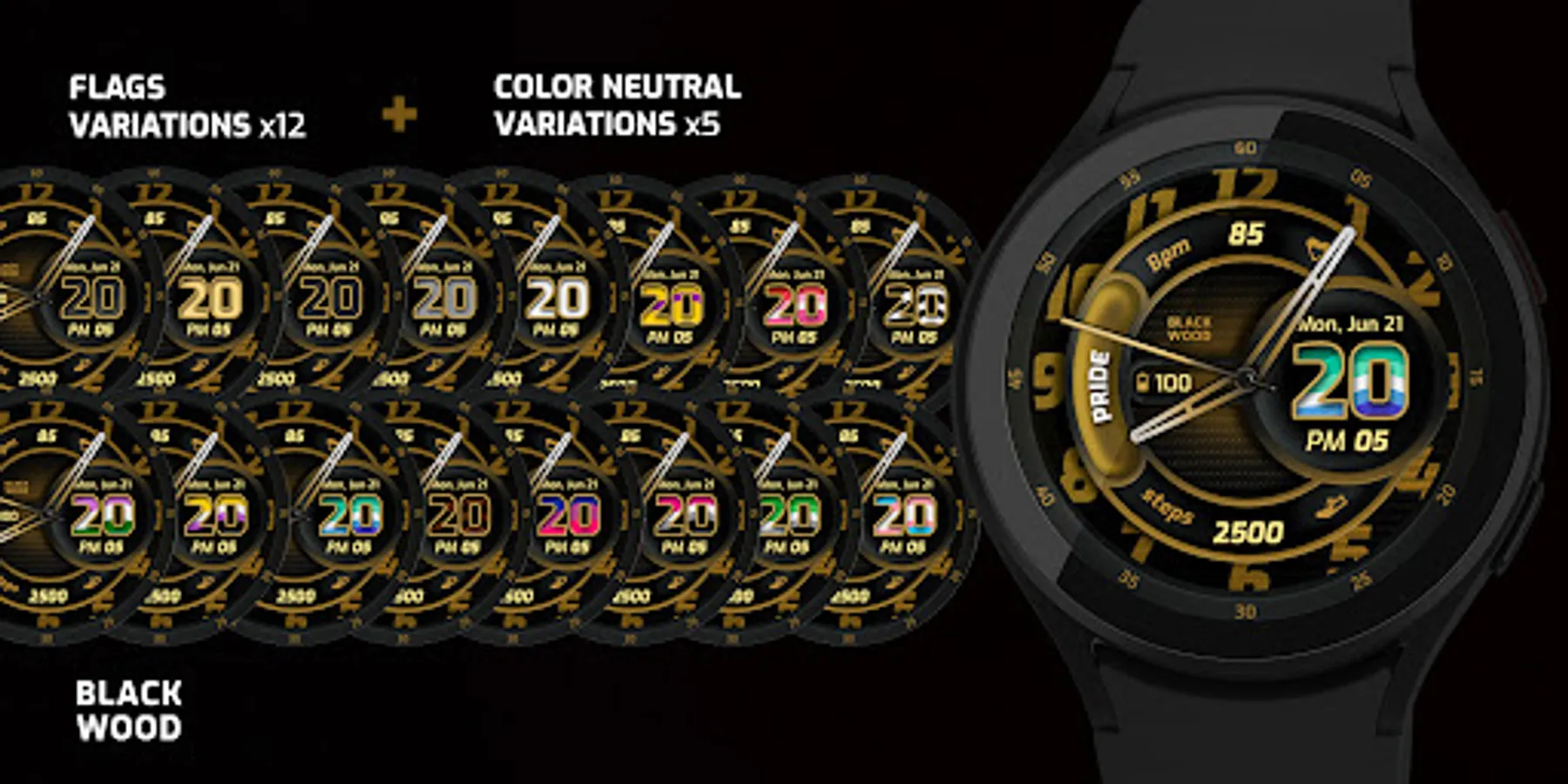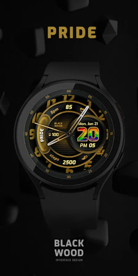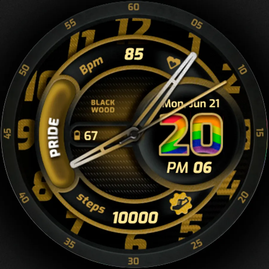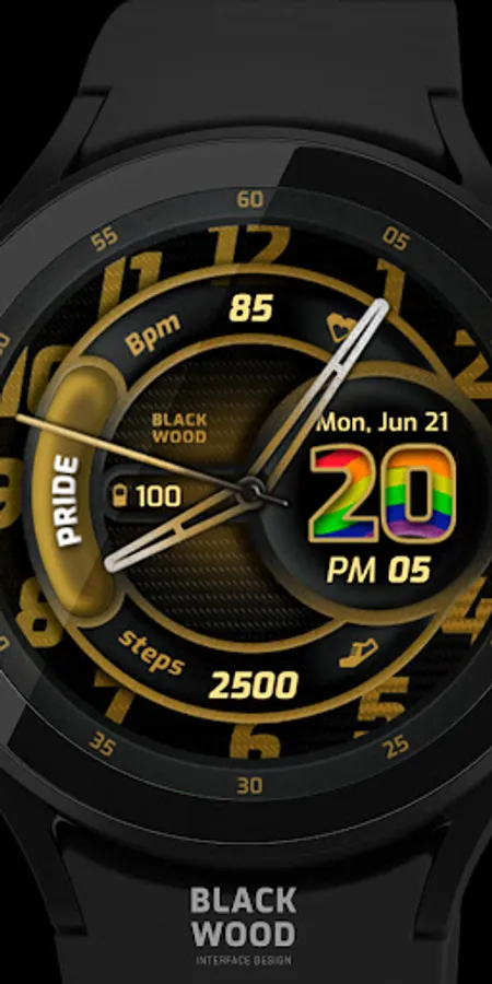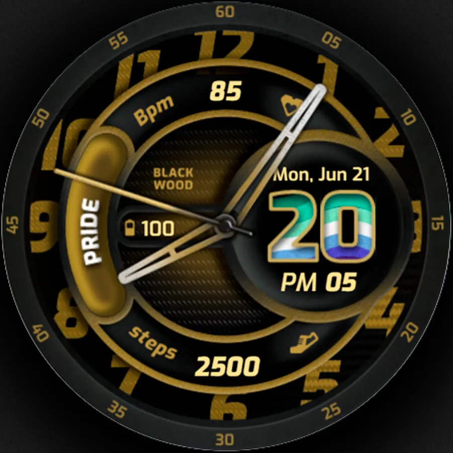 PRIDE is an elegant and golden watch face accented with the flags of the different sexual identities, commemorating the month of pride and the LGTB + community