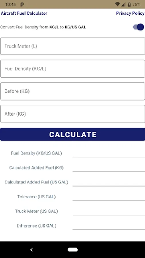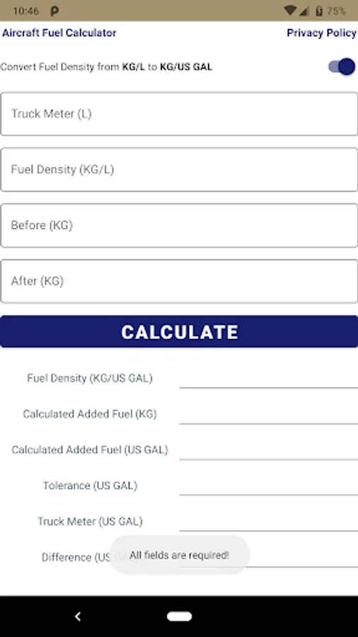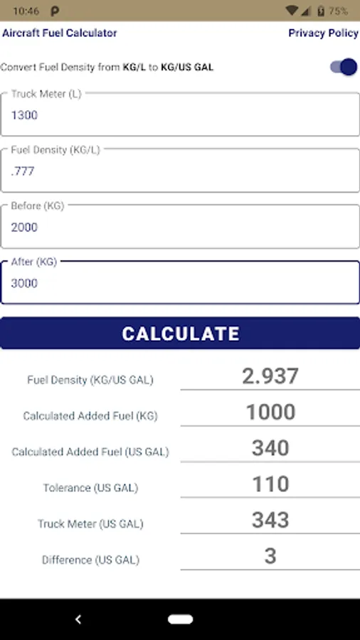 Fuel Density (KG/US GAL or KG/L), Calculated Added Fuel (KG), Calculated Added Fuel (US GAL), Tolerance (US GAL), Truck Meter (US GAL), and Difference (US GAL).