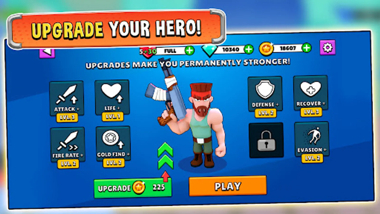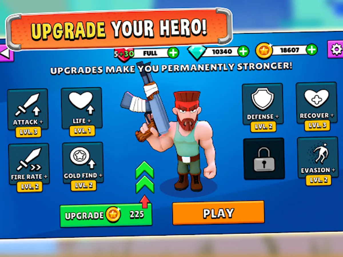 Jump right into the shoot em up action and destroy hordes of vicious enemies with your trusty gun! Unlock tons of awesome perks and powers along the way to give yourself an edge in shooter combat against all kinds of ravenous monsters and hero-hungry freaks.