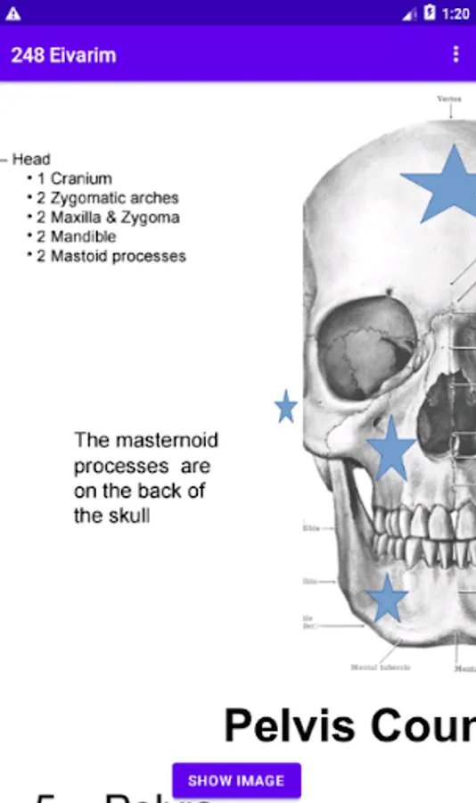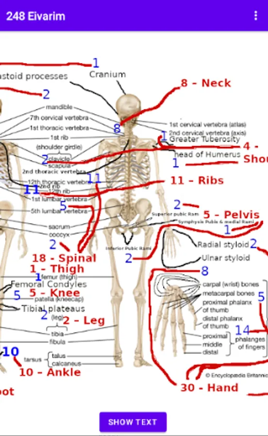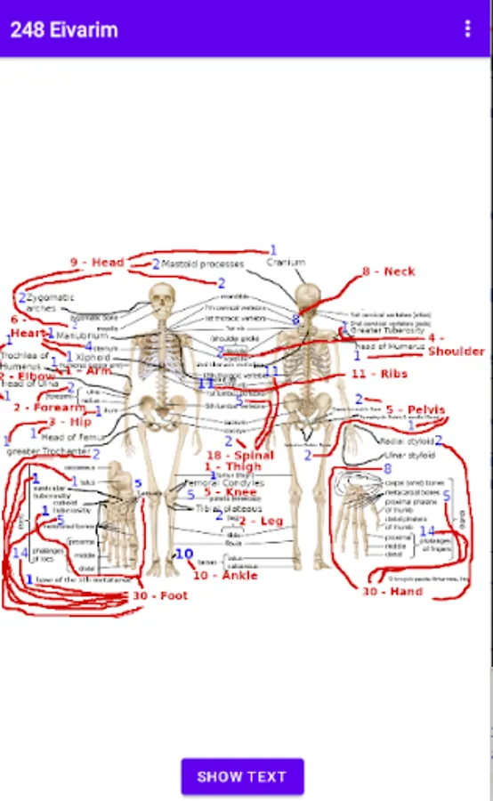 This is an app to show how the Eivarim are split up in a man. Following the Rambam and the Tosefta. The information provided to make this app was given by Rabbi Doctor Speigel and his studies. A great thanks! An image showing all the categories of the body shows up. On which you can click a part of the limb to see in the text how it was divided.