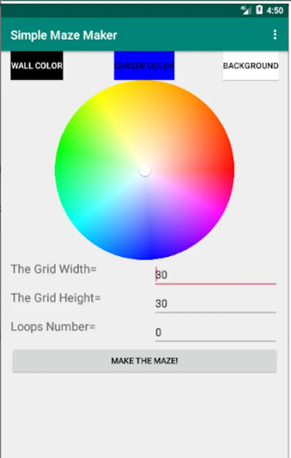 You simply enter the dimensions you want and the colors you want in the fields and press the make maze button. The app then makes the maze!