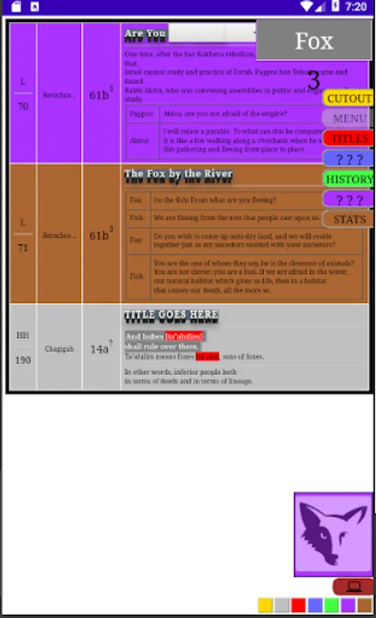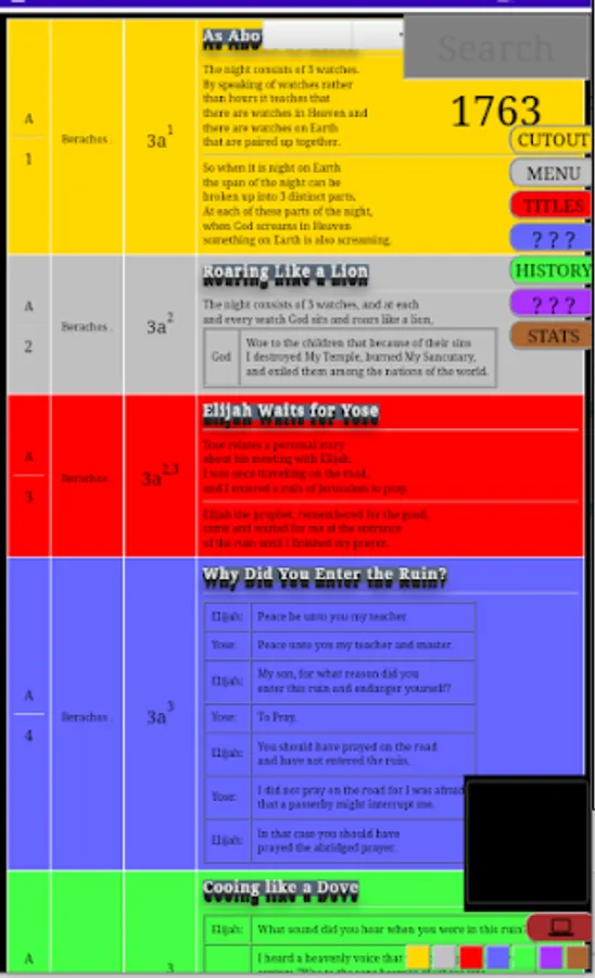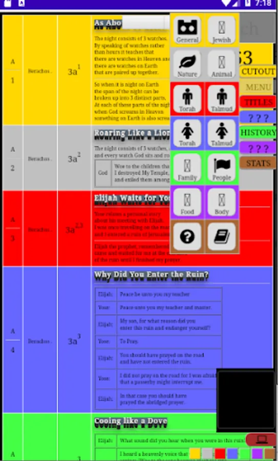 This is a Web App using the internet to interact with Talmudy Click. This is a fun interactive way to hear some very interesting facts from the Talmud in a lively format. There are many colors and things to click on to help keep the person interested in the mysteries of the Talmud.