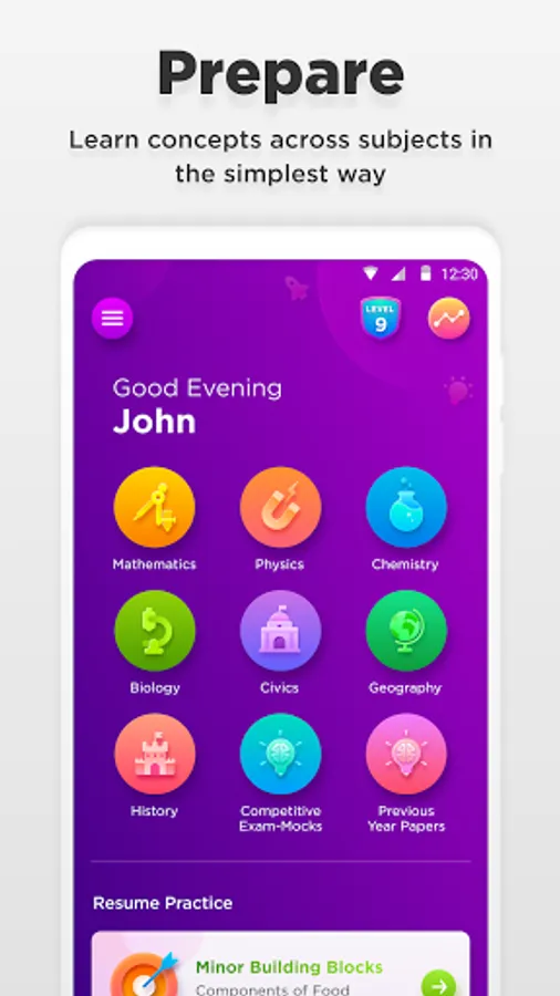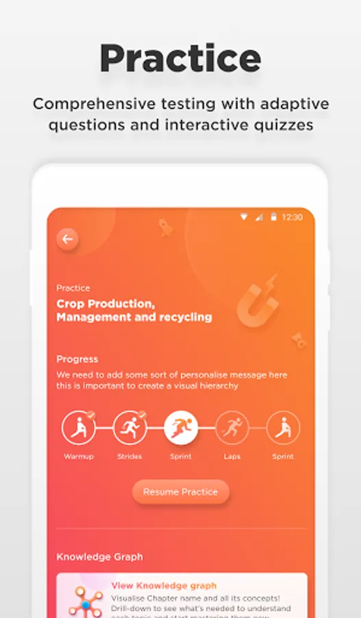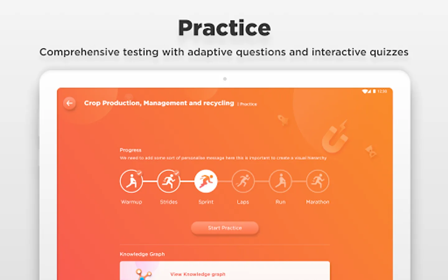 Practice - This feature offers warm up, run and sprint mode for every concept. This unique feature allows students to test at their pace, based on their level of understanding.