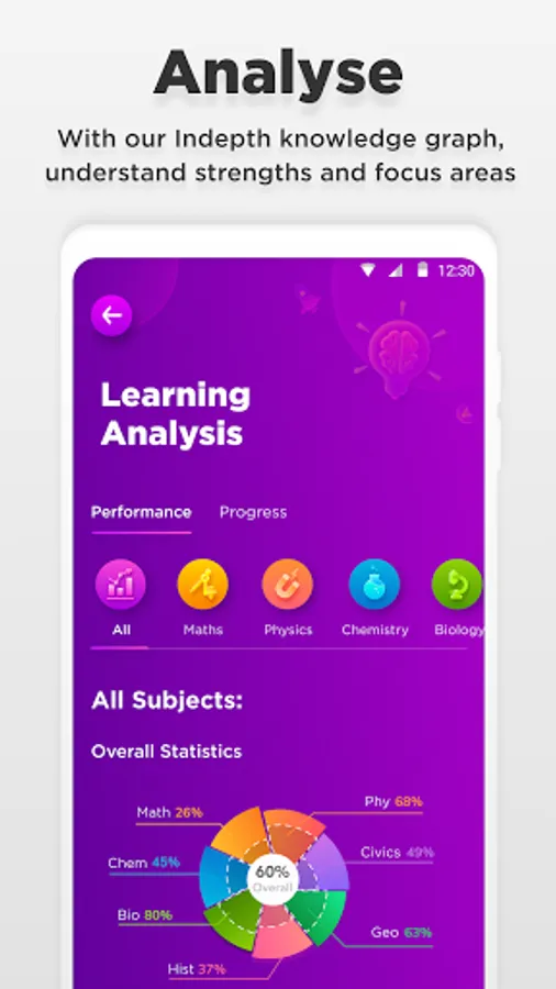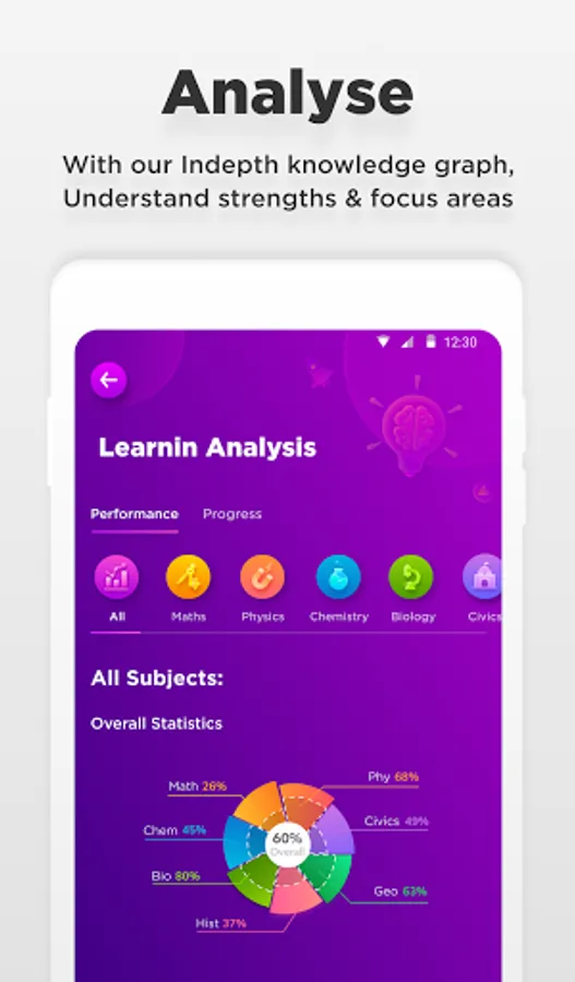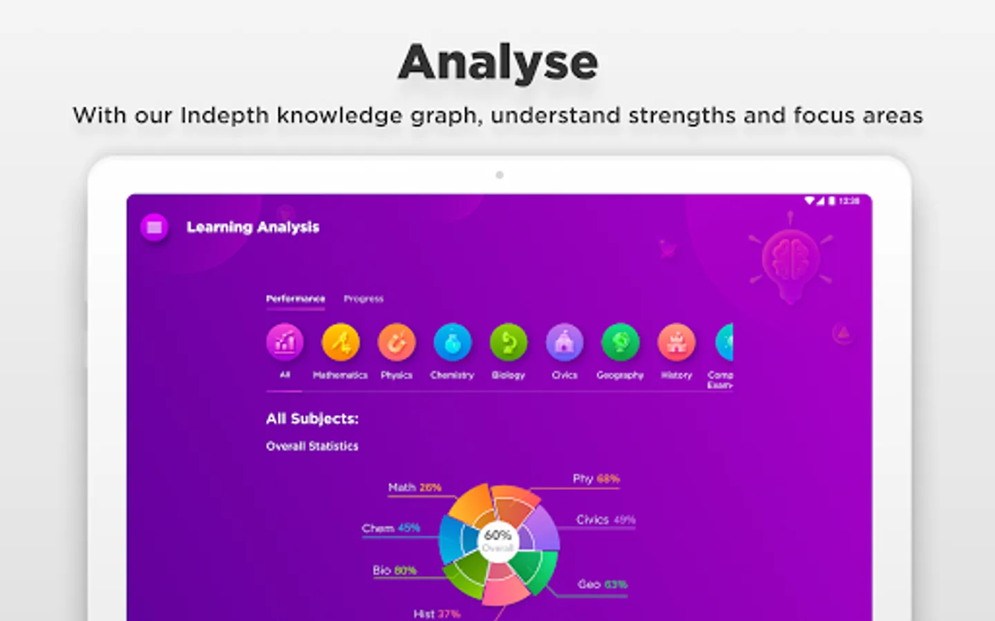 Analyse - The app runs an in-depth analysis based on customized tests and personalised learning paths adopted by the student. Students receive detailed analysis of their progress and performance to plan better and improve.