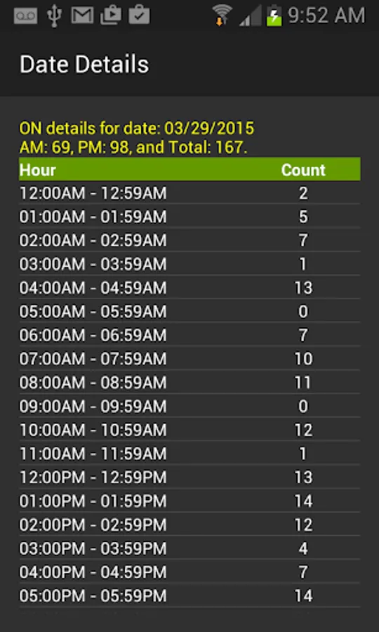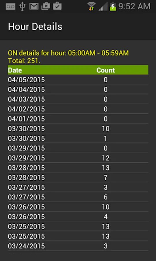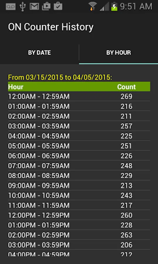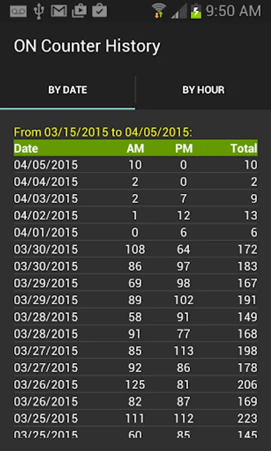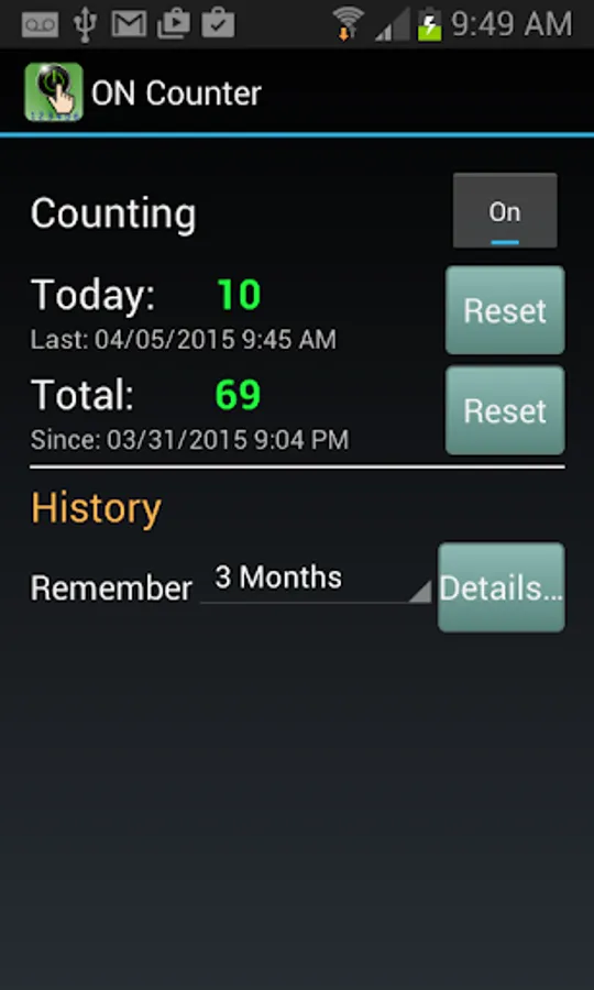 To start, you can simply either add an “ON Counter widget” to your screen or launch the app and turn on the counting. As you continue use your phone normally, few days later you can view the history to see how many times you turned on the phone. The history shows how many times you turned on your phone by daily (AM, PM, and Total) or hourly, and then you can select a date or hour to see more details of that particular date or hour usage.