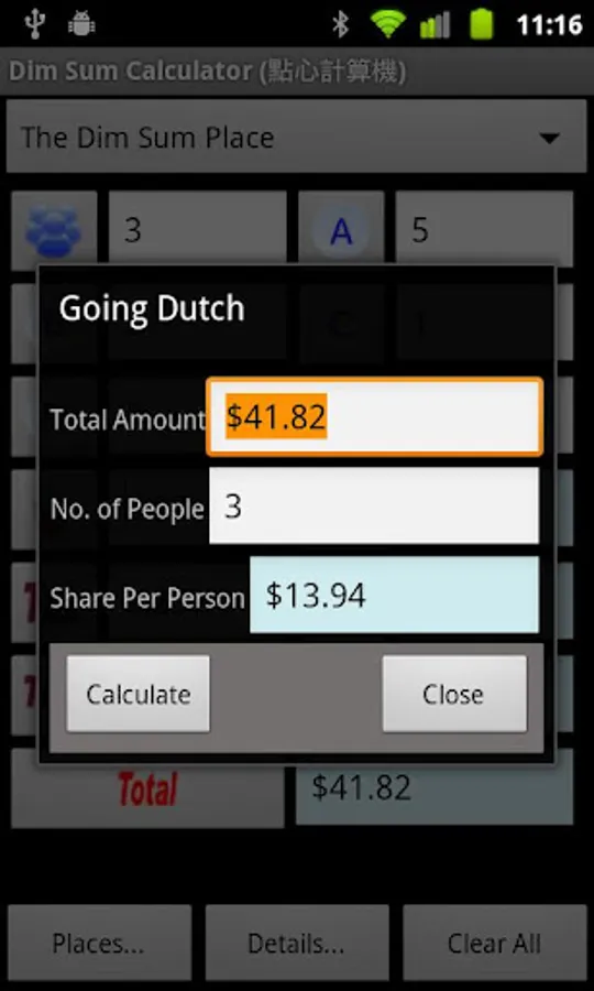 - "Going Dutch" – calculates and splits the bill among the guests.