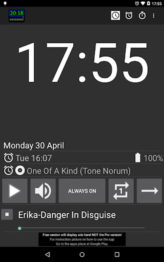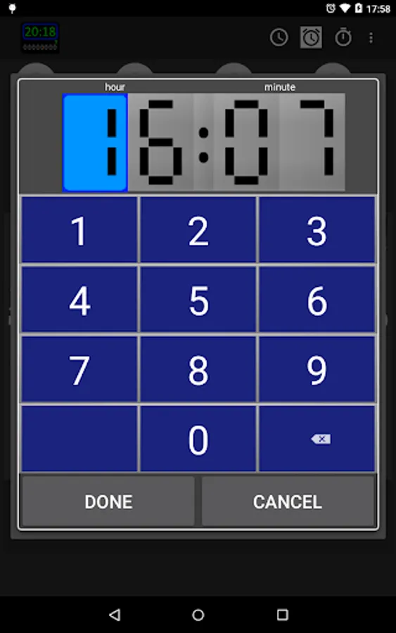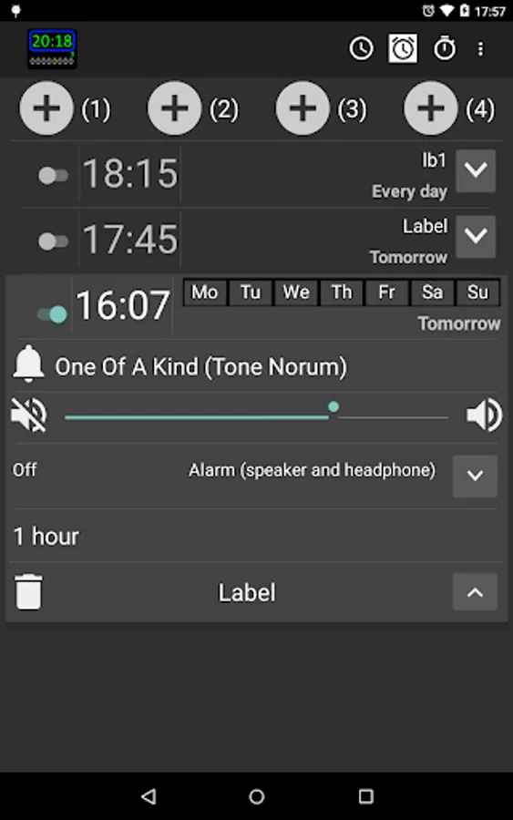 - Customize an alarm: Long click on +(1),+(2),+(3),+(4) or use the menu 'Edit the default alarm (x)' to see that your are in customize mode - instead of the time you will see the name (?) of the button you clicked