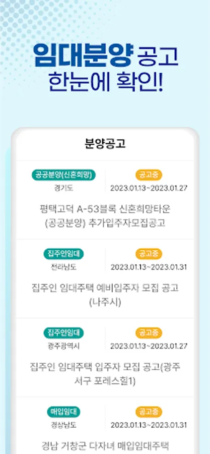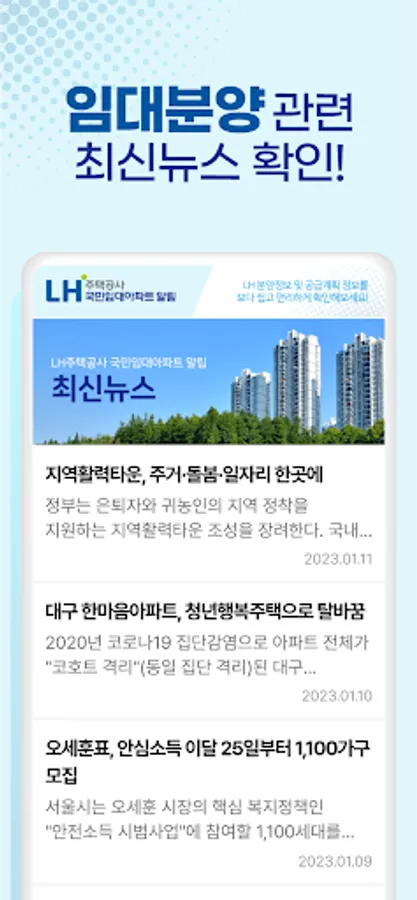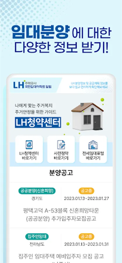 The LH Housing Corporation National Rental Apartment Notification APP is an application that provides information such as the 2023 latest LH sales guide, LH·SH sales announcements, sales policies, etc. .