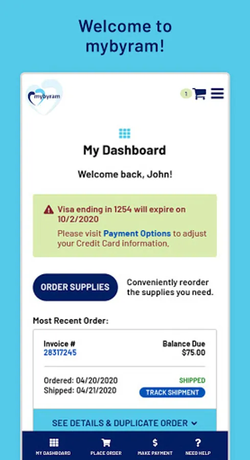 Welcome to mybyram! Reorder your medical supplies - it's simple and secure! Easily place reorders, view your previous order history, update your account information, manage your physician and insurance information, pay a bill, as well as track the progress of your order, including the shipment and delivery of your medical supplies.