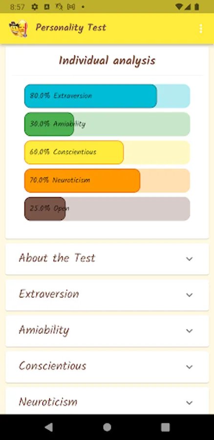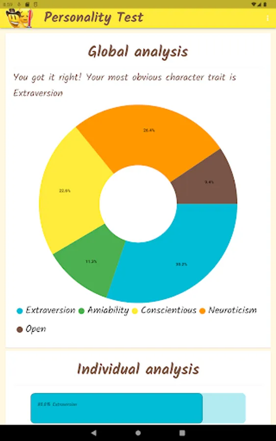 Through a questionnaire with 50 questions, it is possible to evaluate the scores in the 5 factors: Extroversion, neuroticism, kindness, conscientious and openness.