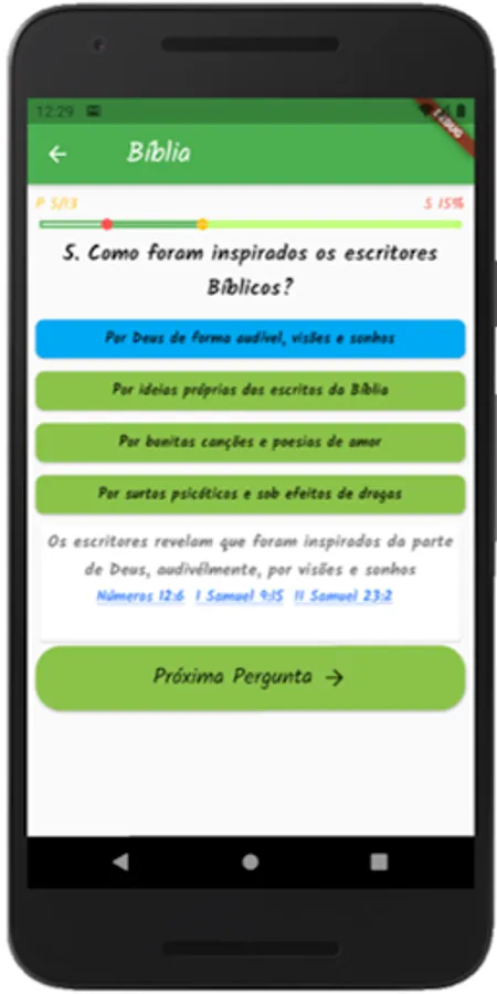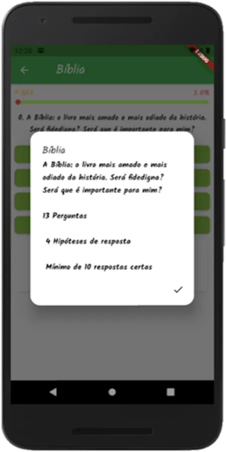 Divided into modules (biblical themes) in which each module has questions with 4 hypotheses to answer, in which only one is true.