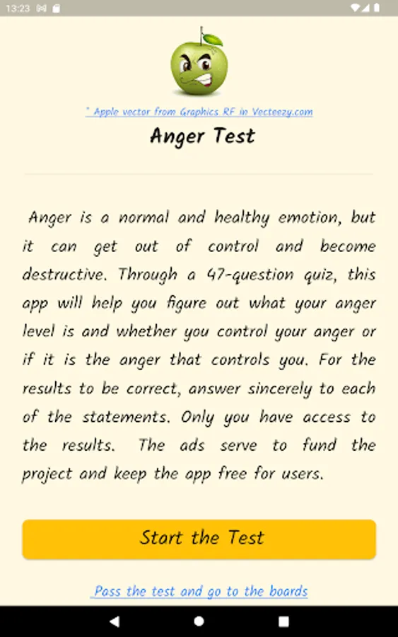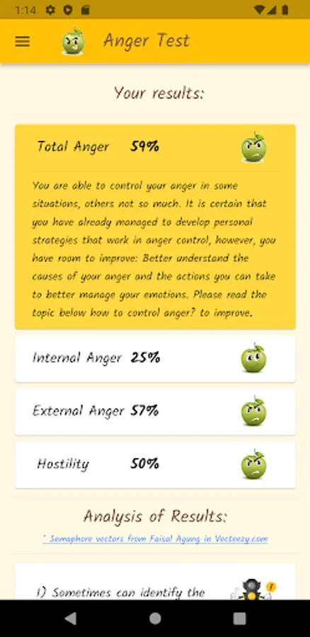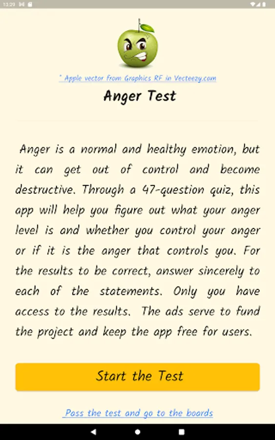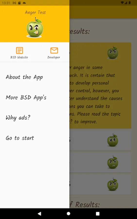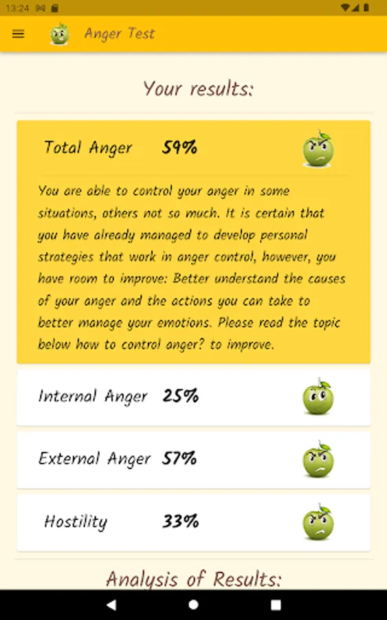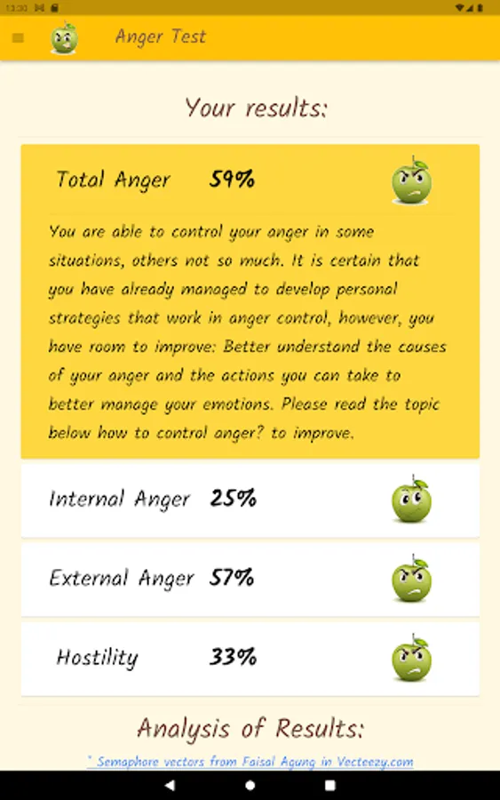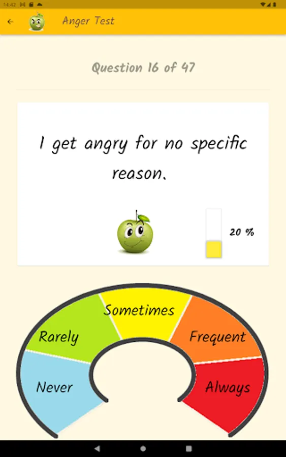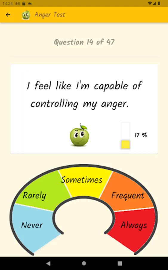 Anger is a normal and healthy emotion, but it can get out of control and become destructive. Through a questionnaire, this app will help you find out what your anger level is, if you control your anger, or if anger controls you. Based on definitions from the Psychopedagogical Support Office of the Faculty of Sciences of the University of Lisbon, the Idaam anger test and the IDRLABS anger test.
