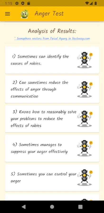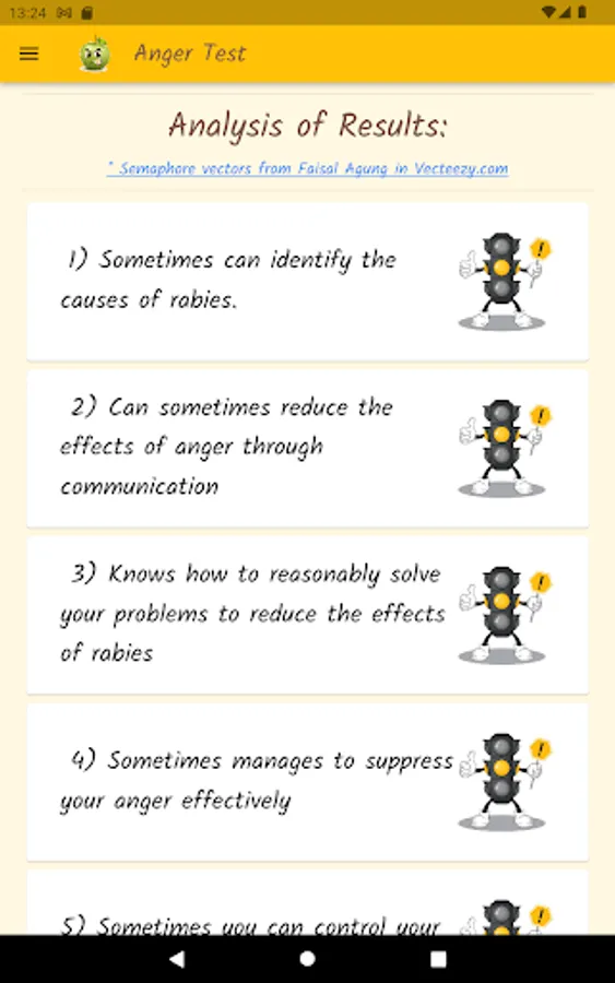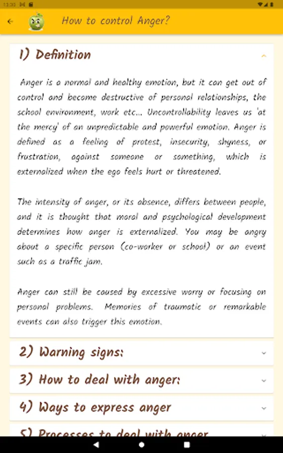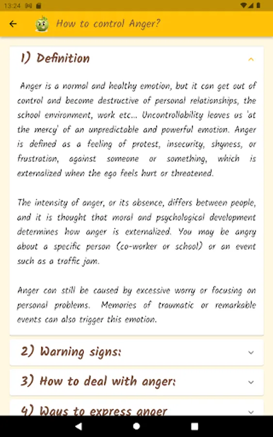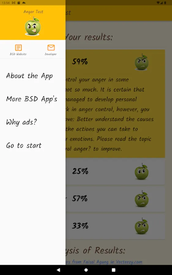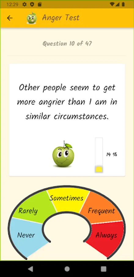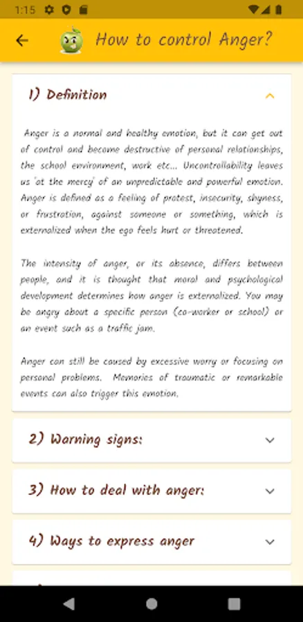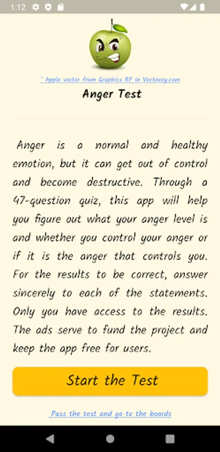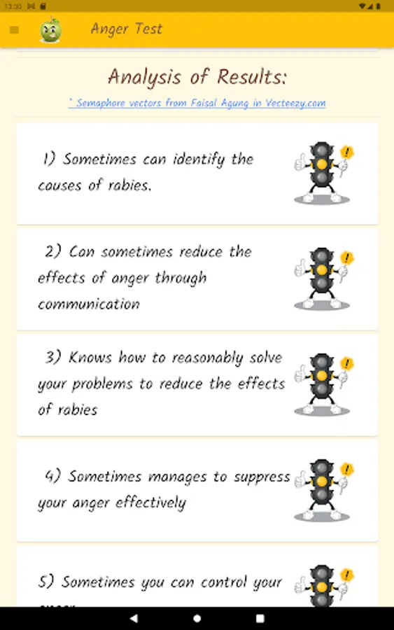 Anger is a normal and healthy emotion, but it can get out of control and become destructive. Through a questionnaire, this app will help you find out what your anger level is, if you control your anger, or if anger controls you. Based on definitions from the Psychopedagogical Support Office of the Faculty of Sciences of the University of Lisbon, the Idaam anger test and the IDRLABS anger test.