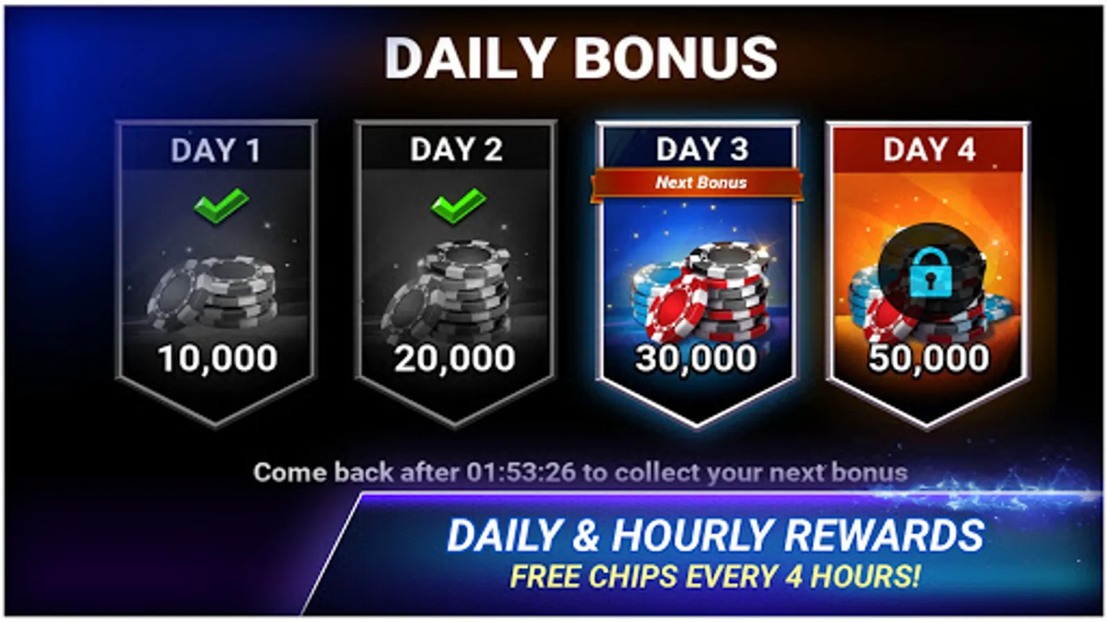 ● Start with 2,50,000 chips. Get Chips every few minutes and Daily Bonus Chips.