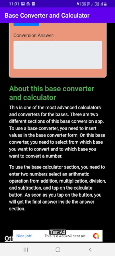 To use any of the above converters, you just need to scroll down to the main form insert all the necessary inputs, and tap on the calculate button. As soon as you tap on the button this app will return the output in either base conversion or base calculation.