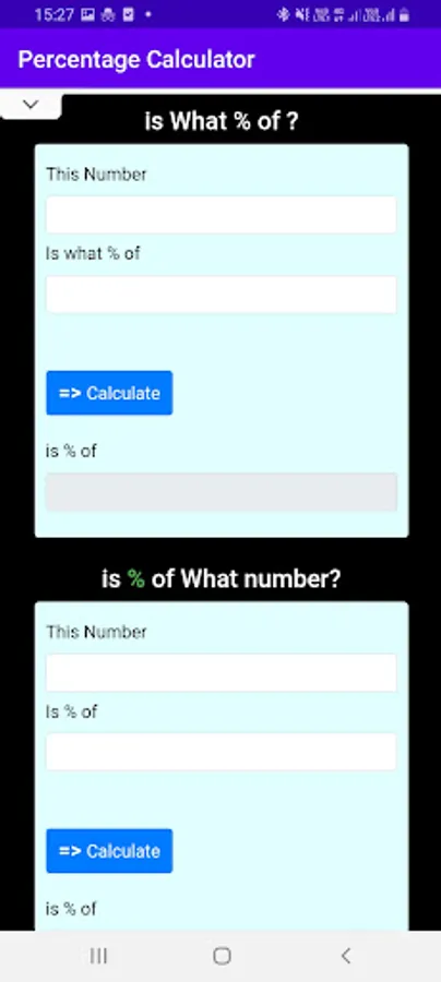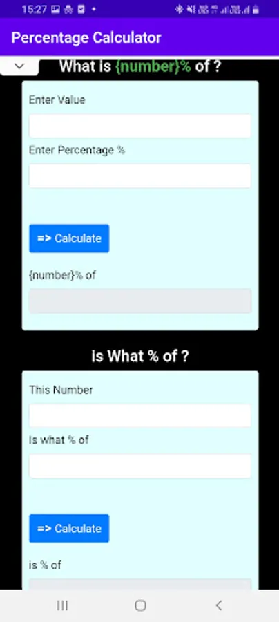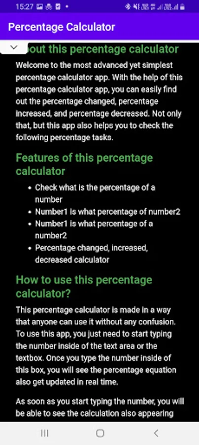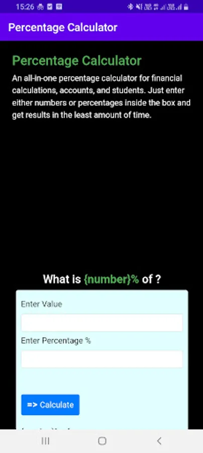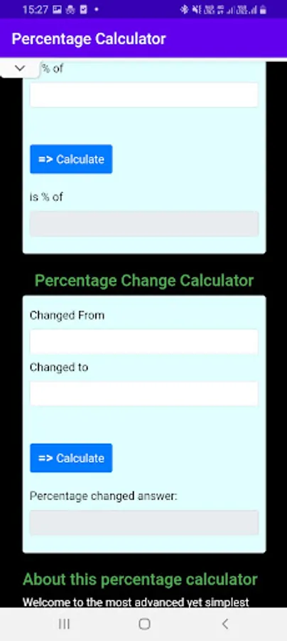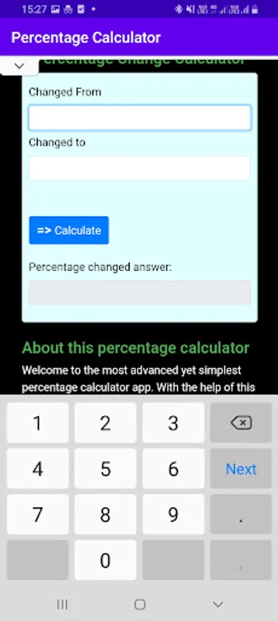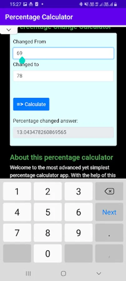 Percentage calculator is an app that helps you to calculate the percentage value from two different numbers. It also shows the percentage change calculation as well.