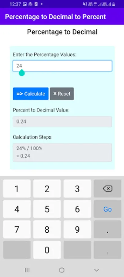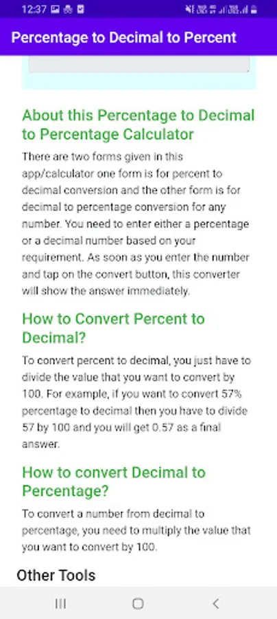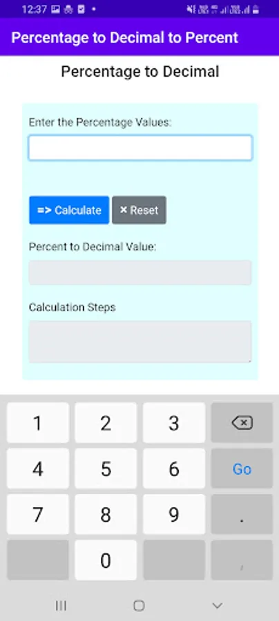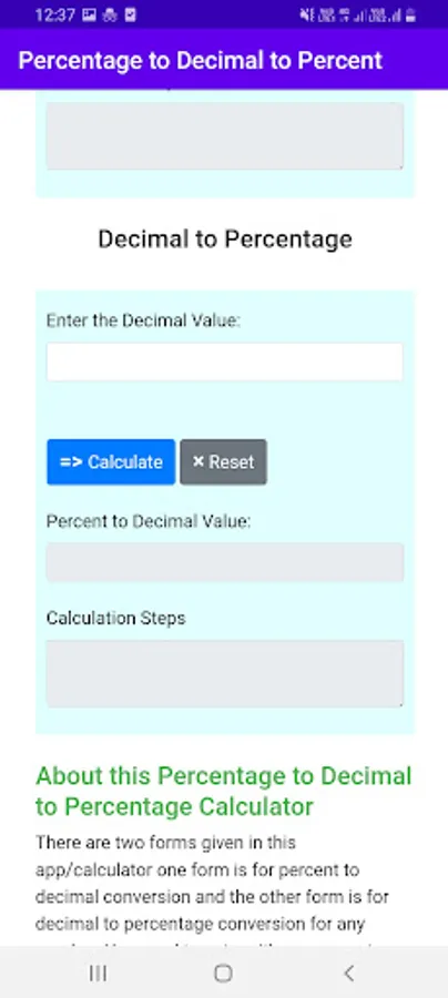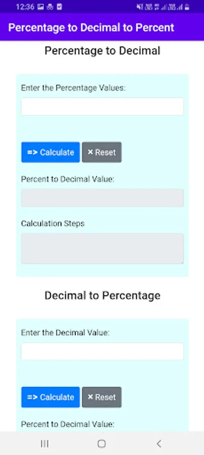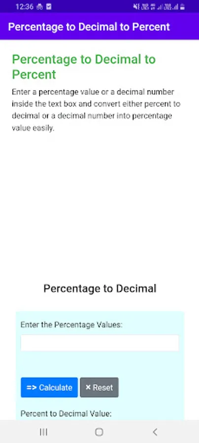 Converting percentage to decimal to percentage has been made simple and easy with the help of this advanced yet simple app. Just enter either a decimal number or a percentage value to get the correct answer.