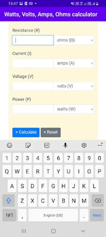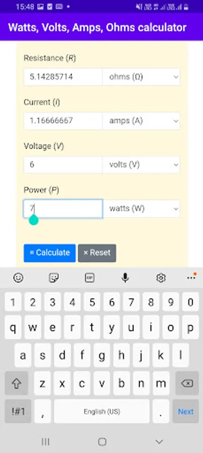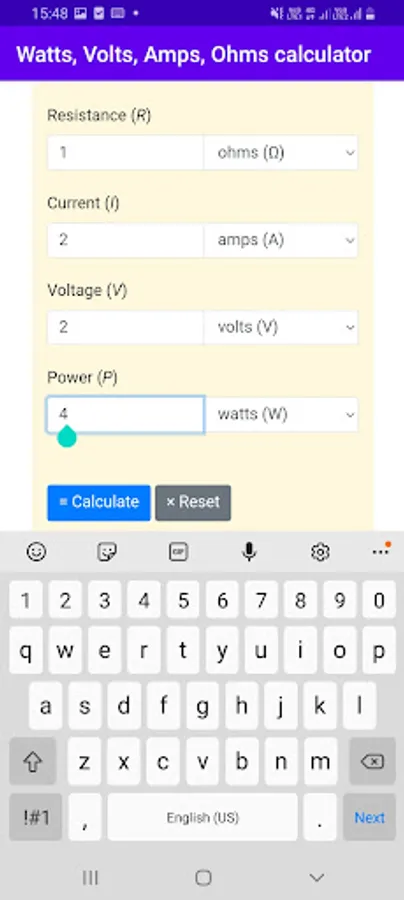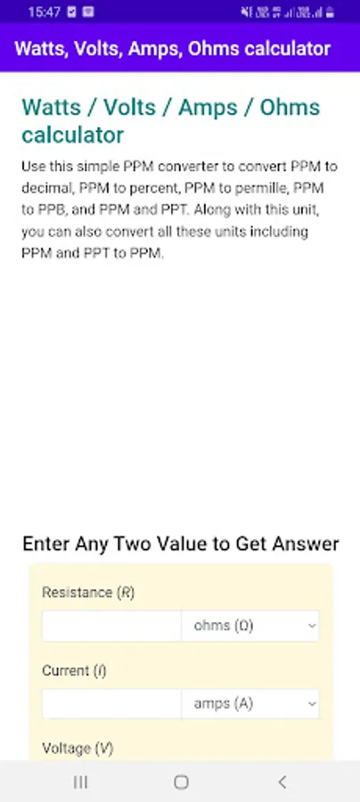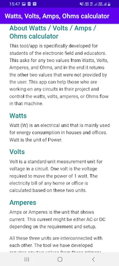 To use this app for watts, volts, amperes, and ohms, you need to enter any two values from all these and tap on the calculate button. As soon as you tap on the calculate button, this app will return the two values from watts, volts, amps, and ohms and show the answer.