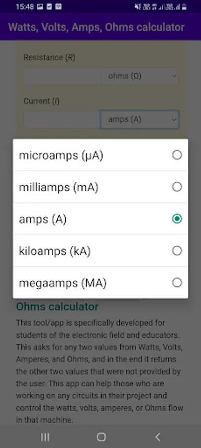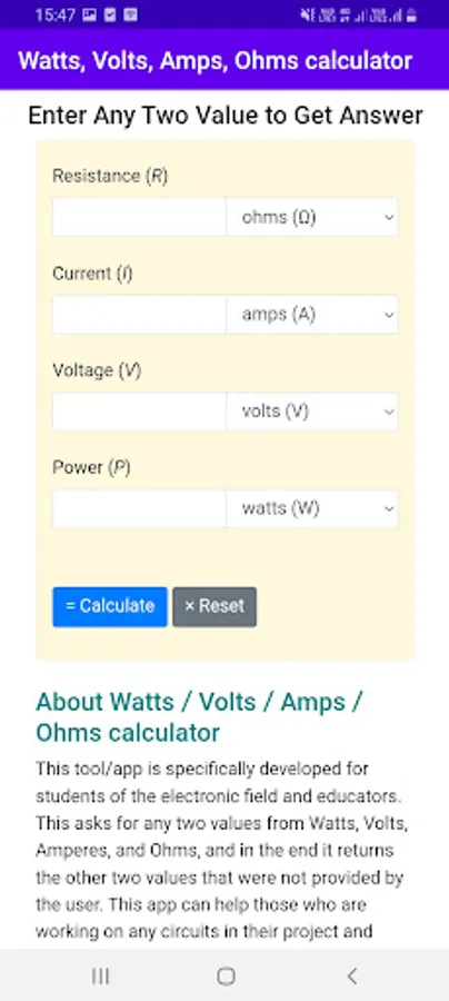 Watts / Volts / Amps / Ohms conversion app is an all-in-one electronics unit conversion app that is specifically developed for students and educators.