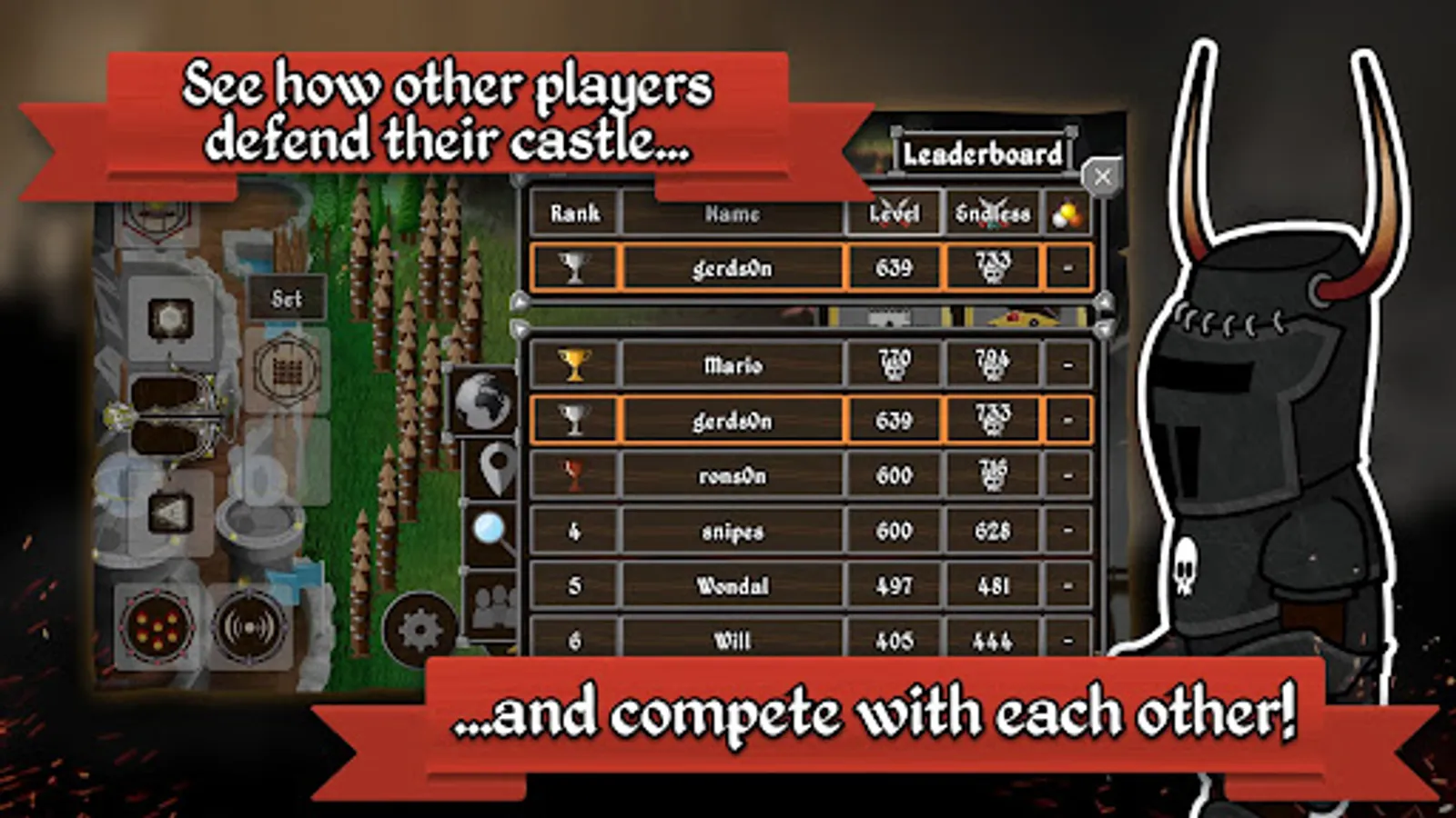See how other players defend their castle and compete in global leaderboards. Participate in the season system: a fresh leaderboard is started every few month to create a fair competition with thousands of other defenders. Play dailies and quests to collect huge bonuses and get ahead of the competition. Reach the highest rank and have the highest level of all players with the best strategy and grow to be a tactical mastermind.