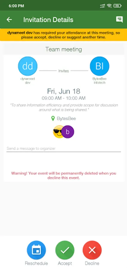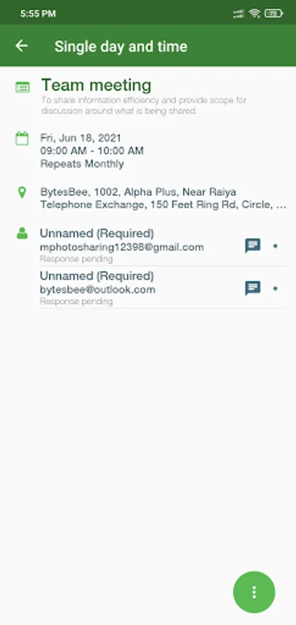 Let DynaMeet manage your meetings for you. Simply enter what, when, where, and who, and DynaMeet does the rest. Reduce the tedious back and forth with invitees. Handles single days and times, multiple days at the same time, or multiple days at different times.